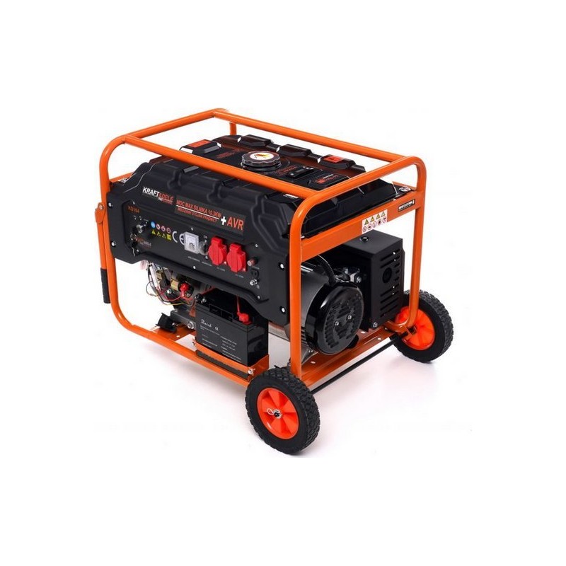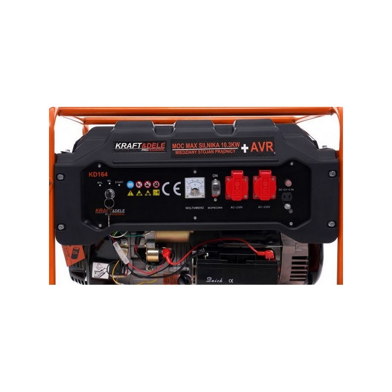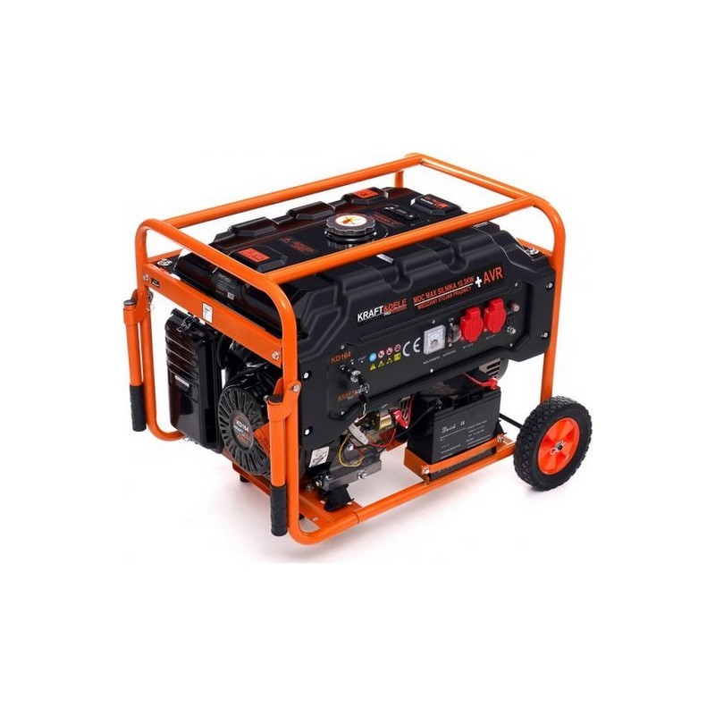 Der tragbare einphasige Stromgenerator mit der Bezeichnung KD164 der Marke Kraft&Dele ist für die Erzeugung von 220V-230V-Wechselstrom mittels eines japanischen OHV-Viertakt-Verbrennungsmotors mit einer Leistung von 15 PS/10,3 kW und einer Nennleistung des Generators von 5000 W ausgelegt.