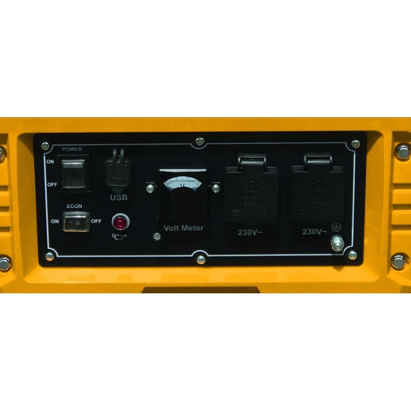 • Es ist mit zwei 230-V-Steckdosen, einem Thermoschutz sowie einem Ölsensor ausgestattet, der den Motor bei Ölmangel abschaltet.