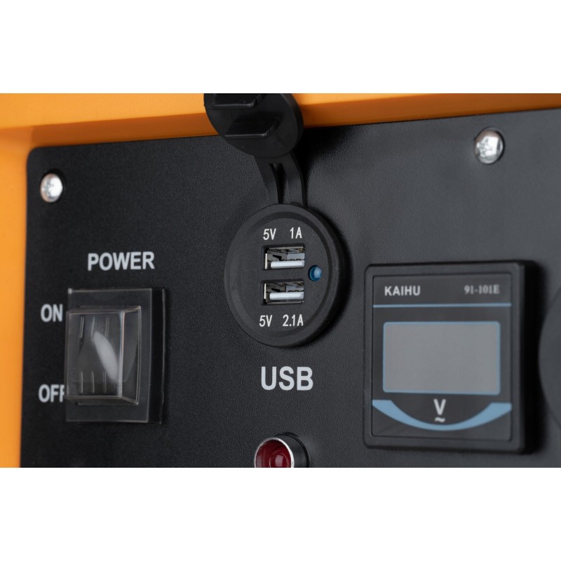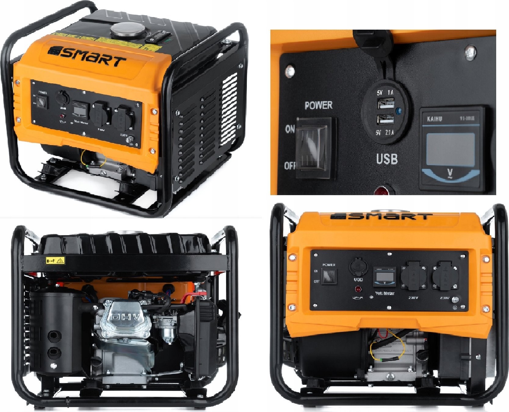 • Der Generator besteht aus einem Motor, einem Generator und einem elektronischen Wechselrichter (Inverter), der Strom mit einer perfekten Sinuswelle erzeugt. Bei dieser Konstruktion sind Frequenz und Spannung unabhängig von der Drehzahl (Belastung) des Generatormotors.