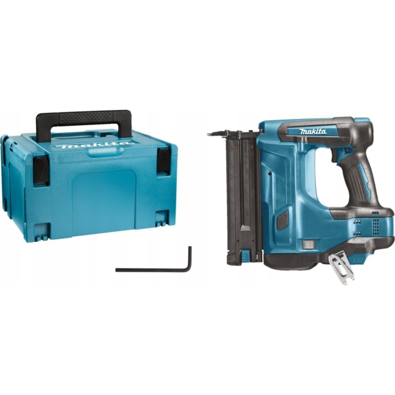 Gummipuffer schützen die Oberflächen des Werkzeugs und des Materials vor Kratzern und Beschädigungen. Durch das transparente Sichtfenster im Magazin lässt sich die Anzahl der Stifte kontrollieren. Der Abstand zwischen der Spitze des Naglers und der Vorderseite des Gehäuses beträgt nur 28 mm, was eine gute Sichtbarkeit gewährleistet, die beim Nageln an engen Stellen erforderlich ist. Das Werkzeug zeichnet sich durch hohe Leistung aus – es kann mit einer einzigen Ladung des Akkus BL1830B etwa 1000 Stifte einschlagen. Es verfügt über einen Schalter für den Einschlagmodus – Einzelschlag oder schneller Serienschlag. Eine LED warnt vor niedrigem Akkustand.