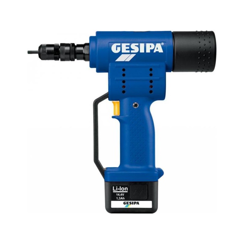 Ausführung: Kompaktes, schlagfestes Gehäuse. Hohe Betriebssicherheit durch elektrische Steuerung. Die Aktivierung des Setzmodus ist funktional von der Ausdrehfunktion getrennt. Die elektronische Steuerung regelt den eingestellten Arbeitshub. Gewindespindeln sowie Arbeitshub-Einstellungen lassen sich schnell und einfach ohne zusätzliches Werkzeug austauschen. Zudem verfügen die Geräte über einen elektronischen Überhitzungs- und Überlastschutz. Ein klappbarer Aufhängebügel ist am Werkzeugkopf angebracht. Handschutz, günstige Schwerpunktlage zur Reduzierung des Kraftaufwands, abnehmbarer Behälter für abgebrochene Nietstifte sowie ein praktischer Griff.