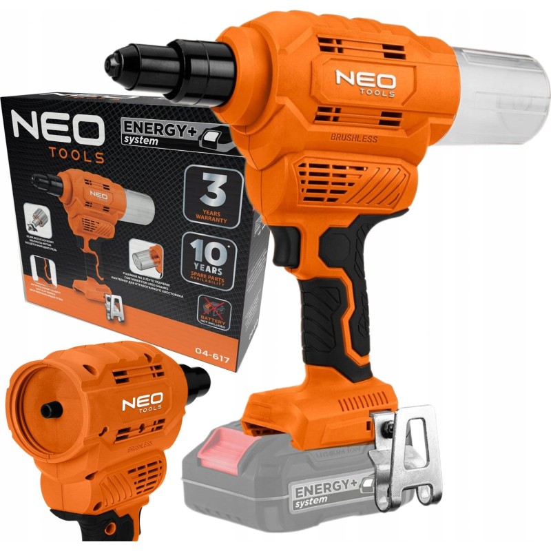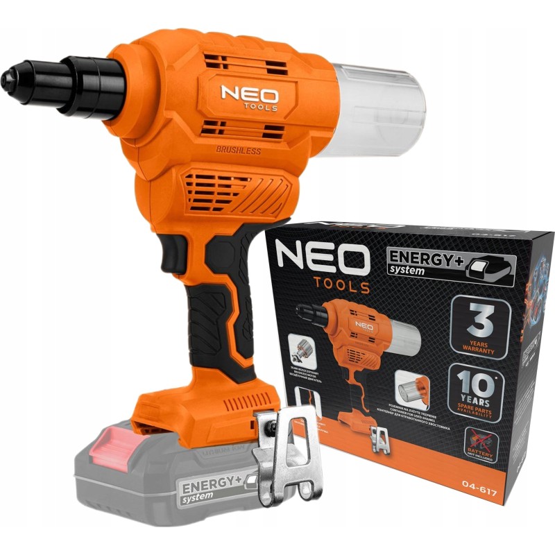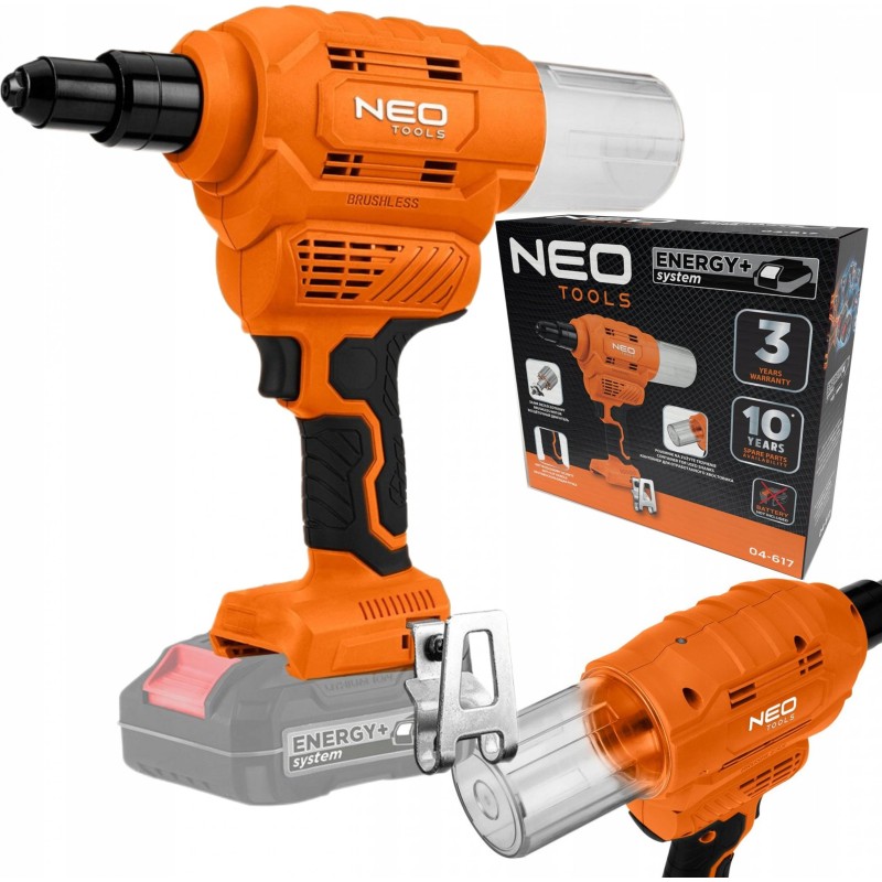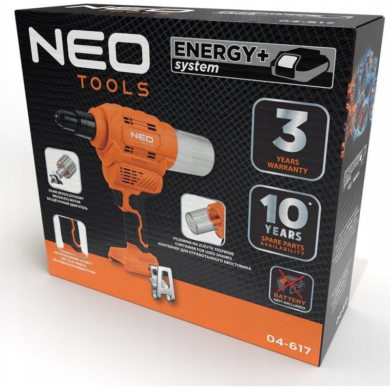 Die 18-V-Akku-Nietmaschine Energy+ 04-617 der Marke NEO ist ein Energy+-Akku-Gerät, das mit 18-V-Lithium-Ionen-Akkus kompatibel ist.