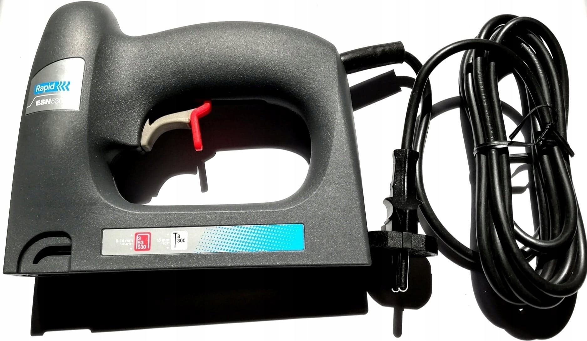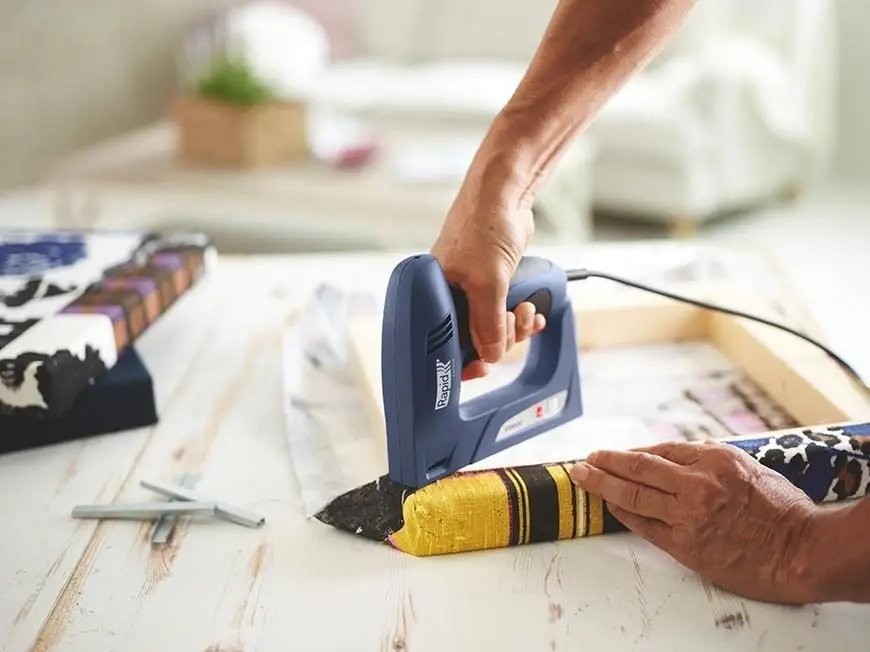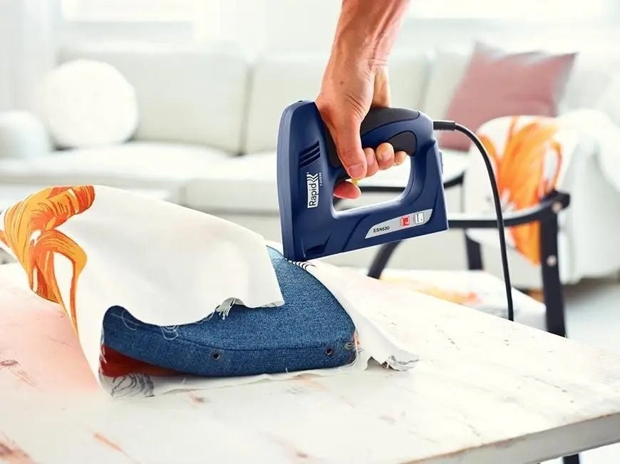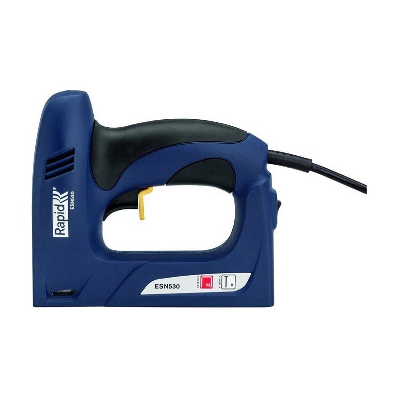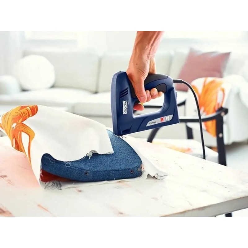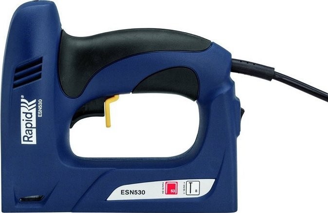 Elektrischer Polstertacker Rapid ESN530 für Rapid 53-Heftklammern und Rapid 8-Nägel. Universeller Tacker für typische Polsterarbeiten, die Befestigung von Stoffen und Isolierfolien sowie alle Innenausbauarbeiten.