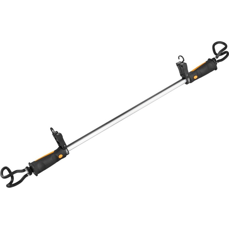 Die batteriebetriebene Motorraumleuchte NEO (Art.-Nr. 99-048) ist mit einer 10-W-SMD-LED mit einem Lichtstrom von 1000 Lumen ausgestattet. Sie verfügt über drei Leuchtmodi: 100 %, 50 % und Blinklicht. Die Lampe wird mit dem im Lieferumfang enthaltenen 3,7-V-Li-Ion-Akku mit einer Kapazität von 4000 mAh betrieben. Magnete in den Sockeln ermöglichen eine stabile Befestigung der Lampe auf Metalloberflächen. Ein weiterer Vorteil sind die seitlichen Haken sowie die verstellbaren Halterungen im Bereich von 130 bis 200 cm. Die Lampe eignet sich ideal für Autoreparaturen.