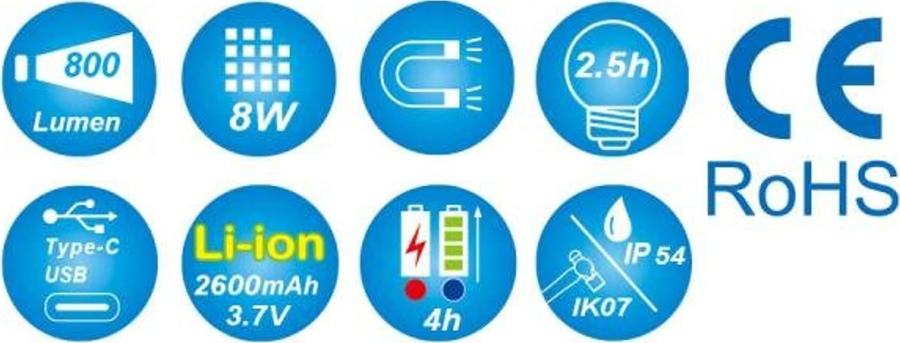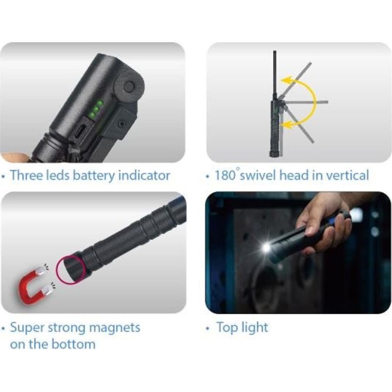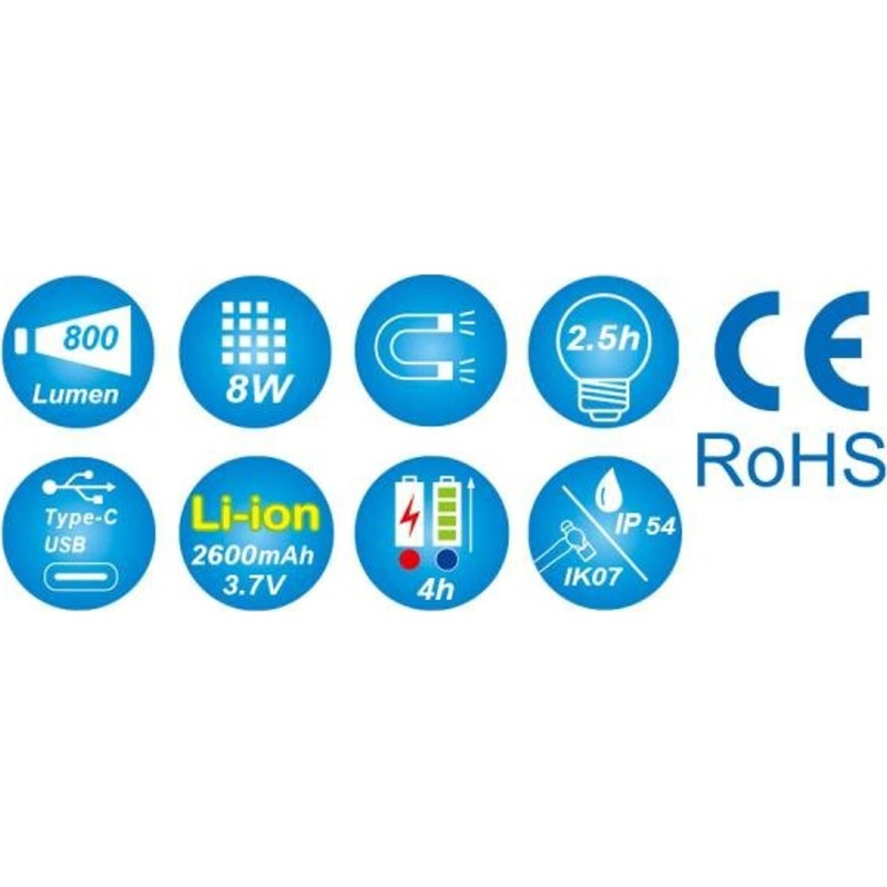 Weißlichtfarbe: 6500 K. Lichtstrom- und Betriebszeit-Einstellung: - Oberer Scheinwerfer: 120 lm; 8 Std. - Seitlicher Scheinwerfer 1: Niedrig/Hoch: 150/800 lm; 8/2,5 Std. – Seitenscheinwerfer 2: Niedrig/Hoch: 120/400 lm: 9/4 Std. Material: PA + Gummi + Aluminiumgehäuse. 180° vertikal schwenkbarer Kopf. Stabiler Magnetfuß. Akku: Lithium-Ionen 3,7 V – 2600 mAh. Zubehör: USB-C-Ladekabel und USB-Ladegerät 5 V 1 A. LED-Akkuanzeige. Ladezeit: 4 Std.