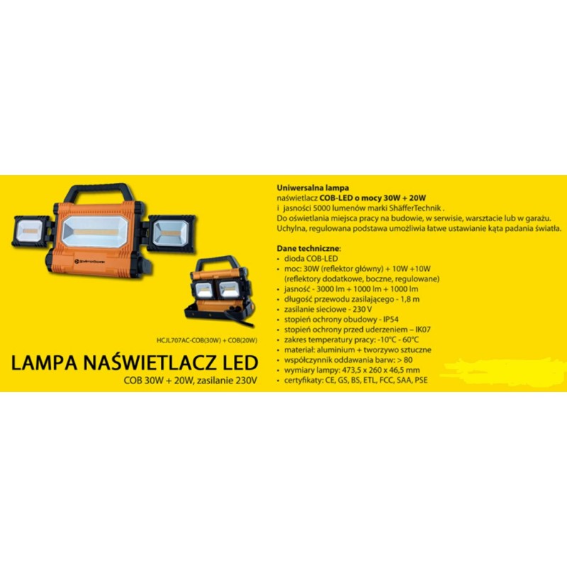 Universelle COB-LED-Arbeitsleuchte mit einer Leistung von 30 W sowie zusätzlichen 20 W und einer Lichtstärke von 5000 Lumen der Marke ShäfferTechnik zur Beleuchtung des Arbeitsbereichs auf Baustellen, in Werkstätten, Servicebetrieben oder Garagen. Der neigbare, verstellbare Sockel ermöglicht eine einfache Einstellung des Lichtwinkels.