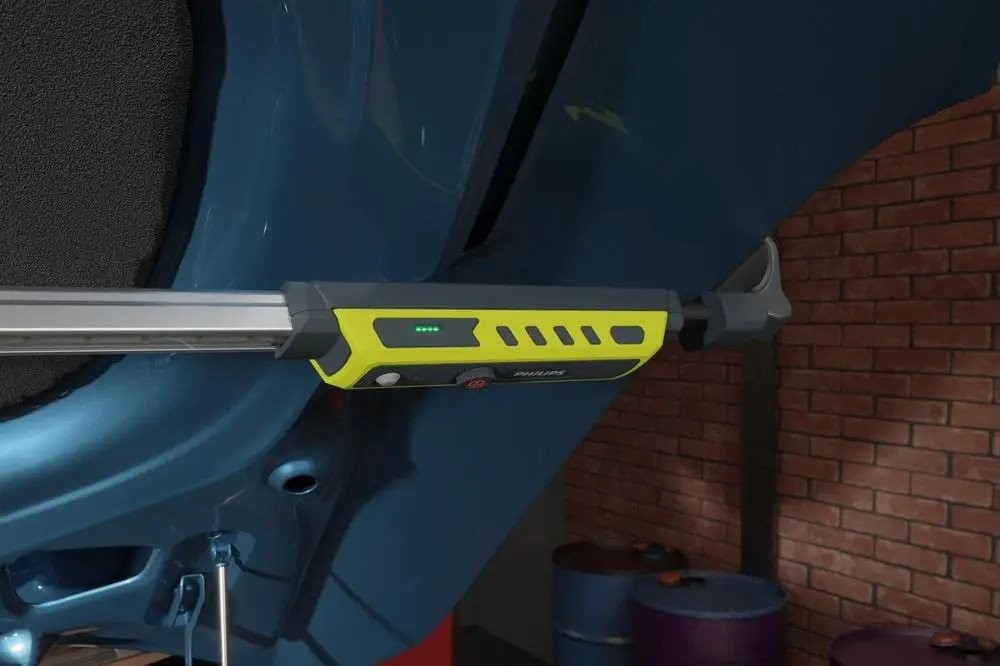 Die Lampe ist mit einem Teleskoparm ausgestattet, der sich von 1,10 m bis 2,08 m ausziehen lässt. Diese Konstruktion ermöglicht die einfache Ausleuchtung schwer zugänglicher Stellen, was bei Arbeiten unter der Motorhaube oder in anderen beengten Räumen äußerst nützlich ist.