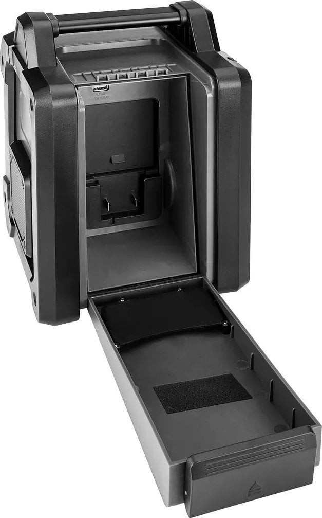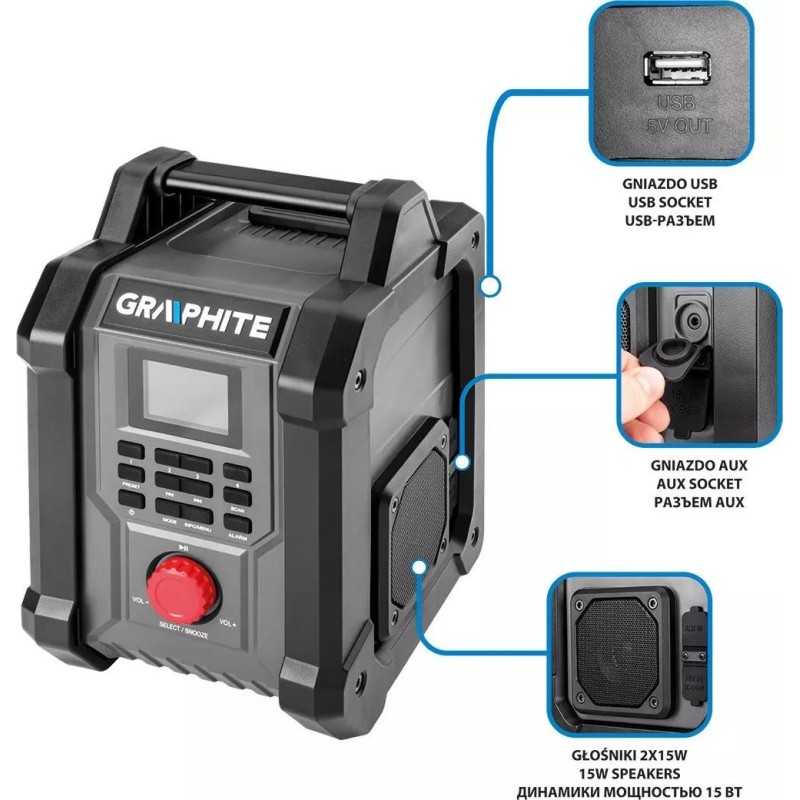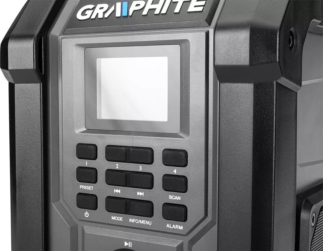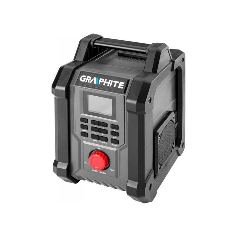 Das Akku- und Netzbetriebene Baustellenradio Energy+ 18 V 58GE128 der Marke GRAPHITE ist ein Akku- und Netzgerät, das mit zwei leistungsstarken 15-W-Lautsprechern sowie USB- und AUX-Anschlüssen ausgestattet ist. Es funktioniert sowohl mit 18-V-Lithium-Ionen-Akkus des Energy+-Systems als auch im Netzbetrieb. Das Radio unterstützt 30 FM-Sender (87,5 – 108 MHz), 30 DAB-Sender (174 – 240 MHz) sowie Bluetooth 5.0. Es ist mit einer Sleep-Funktion, einem Wecker und einer Uhr mit automatischer Zeitumstellung ausgestattet, was den Bedienkomfort erheblich erhöht. Das Gerät verfügt zudem über ein 2,4-Zoll-Farbdisplay mit Helligkeitsregelung, das die Einstellung der Parameter erleichtert. Die Handyhalterung in der Abdeckung ermöglicht wiederum einen bequemen Anschluss des Handys an das Radio. Es eignet sich hervorragend für die Baustelle, die Halle oder die Werkstatt eines Mechanikers. GRUNDLEGENDE DATEN Bruttoabmessungen (B x H x L) 23,30 x 20,20 x 33,50 cm Gewicht 3,67 kg Farbdisplay Ja Anzahl der Lautsprecher 2 Stück Lautsprecherleistung 15 W FM-Frequenz 87,5 – 108 MHz DAB-Frequenz 174 – 240 MHz Bluetooth-Reichweite 10 m USB-Anschluss Ja AUX-Anschluss Ja Nennimpedanz 4? CE-Zertifizierung: Ja Akkutyp: Li-Ion Versorgungsspannung: 230 V~50 Hz Anzahl der Akkus im Lieferumfang: 0 Stück Garantie: 3 Jahre Anzahl der Stück im Lieferumfang: 1 Stück Akkuspannung: 18 V Bluetooth: Ja, 5.0 Funktionen: Sleep-Funktion, Wecker und Uhr mit automatischer Einstellung ...