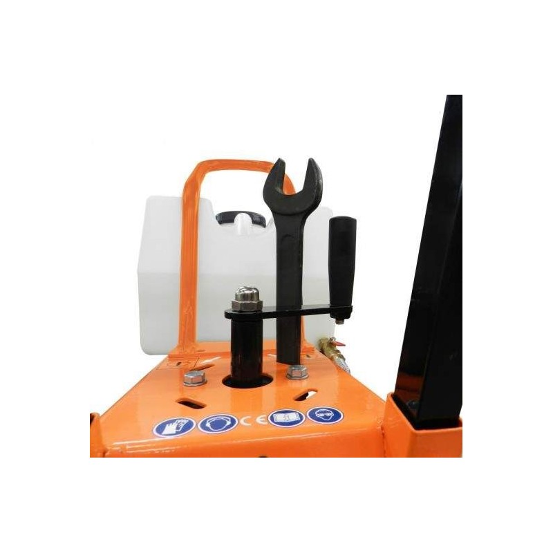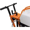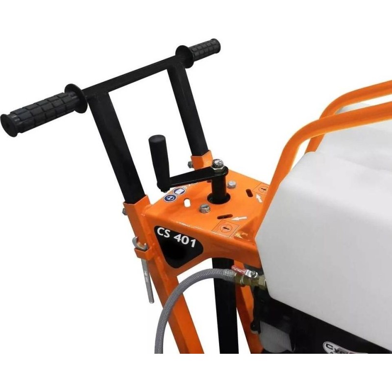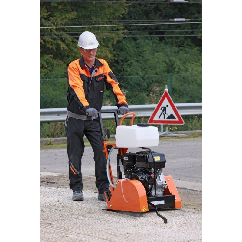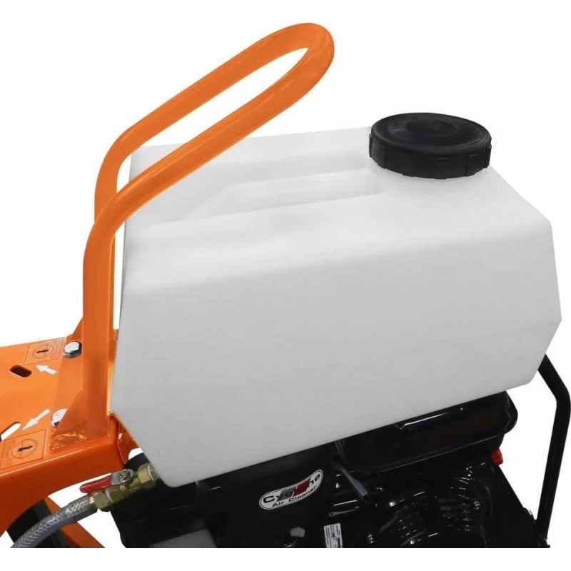 Der Motor ist mit einem CYCLONE AIR CLEANER ausgestattet, der die Lebensdauer des Luftfilters verlängert, was zu einem besseren Schutz des Motors und einem störungsfreien Betrieb führt. Die Schneidemaschine ist mit vier Rädern (zwei größere hinten), einer Schnittführung und einem 20-Liter-Wassertank ausgestattet.