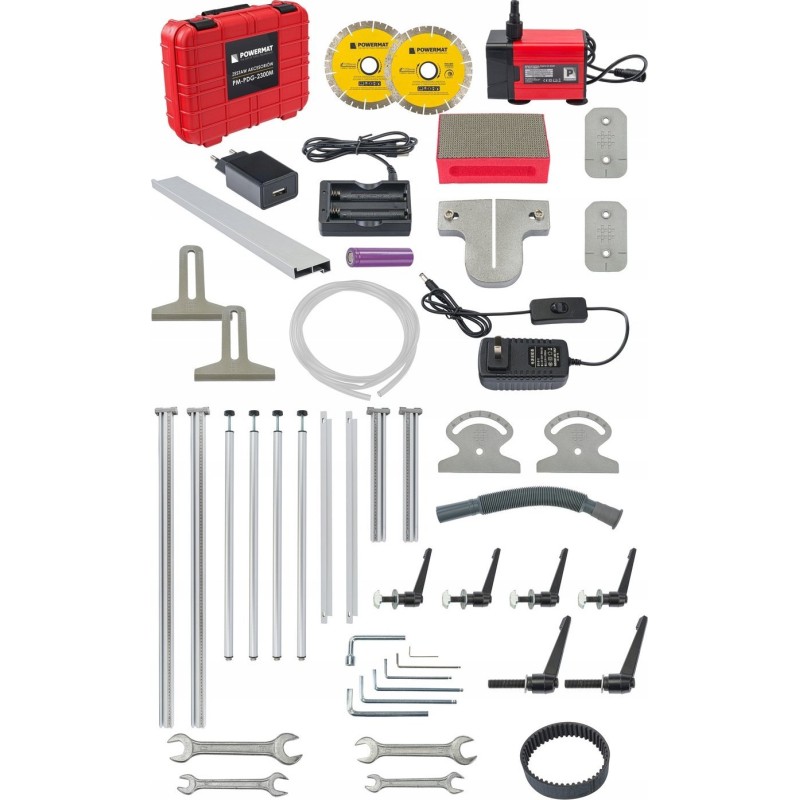 Die PM-PDG-2300M ist zusätzlich mit einer Wanne ausgestattet, die überschüssigen Staub zusammen mit dem Wasser auffängt, sodass dieser nicht über die Seiten des Tisches läuft, sondern über einen Kanal und ein Abflussrohr in einen Wassertank geleitet wird, der neben dem Tisch aufgestellt werden kann.