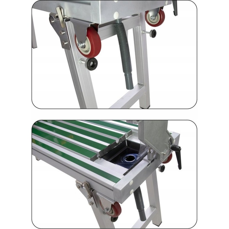 • Die kompakten Abmessungen erleichtern den Einsatz in engen Räumen sowie auf Balkonen oder Terrassen. Mobilität, einfaches Auf- und Abklappen sowie die Ausstattung mit kugelgelagerten Rollen und die Vermeidung von Wasseransammlungen ermöglichen ein einfaches Umstellen auf der Baustelle während der Arbeit.