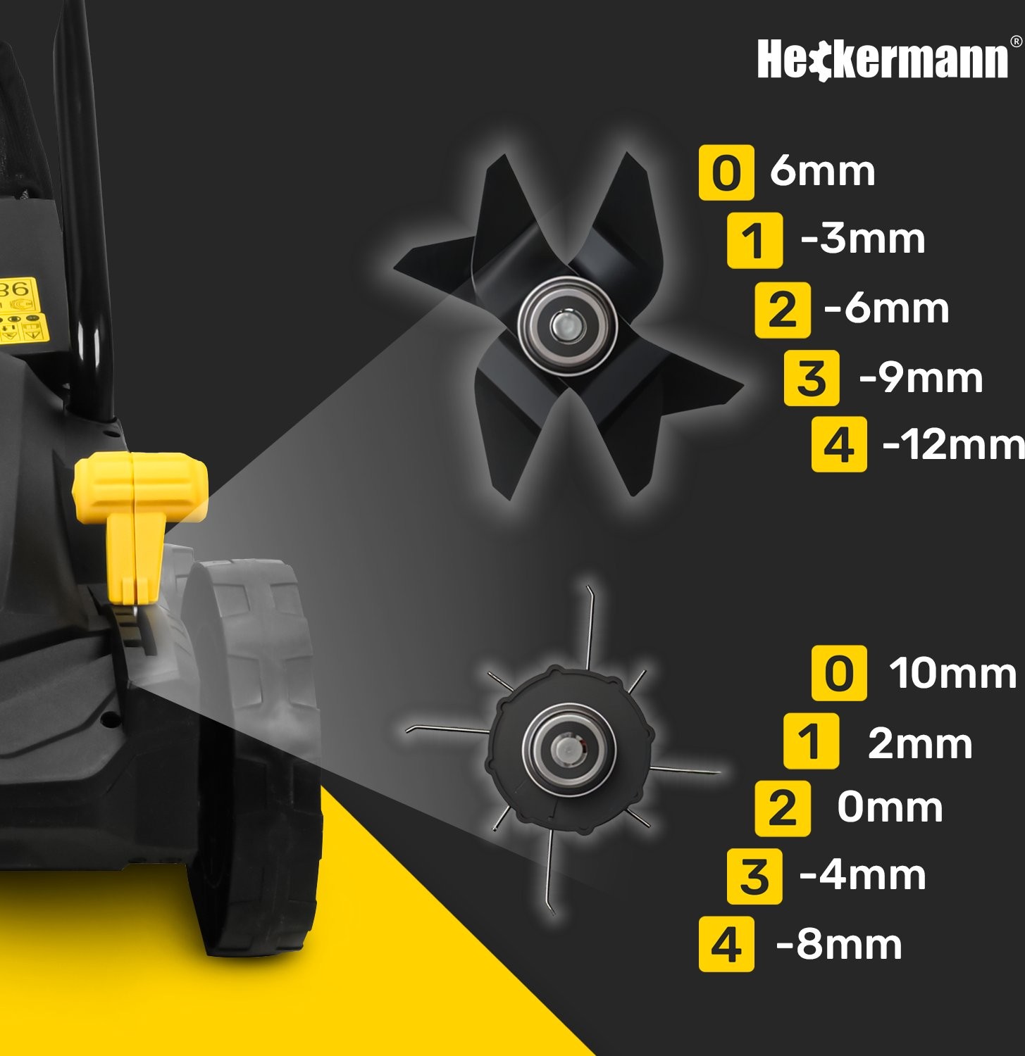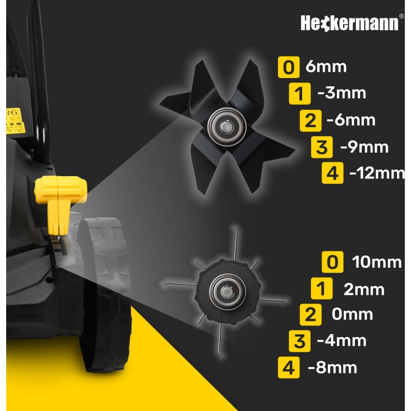 Der Heckermann-Vertikutator SVWA15 bietet eine 4-stufige Einstellung der Arbeitstiefe, wodurch er präzise an die Bodenbedingungen angepasst werden kann. So entfernen Sie effektiv verdichteten Rasenfilz und Moos und verbessern die Versorgung der Graswurzeln mit Luft und Nährstoffen.