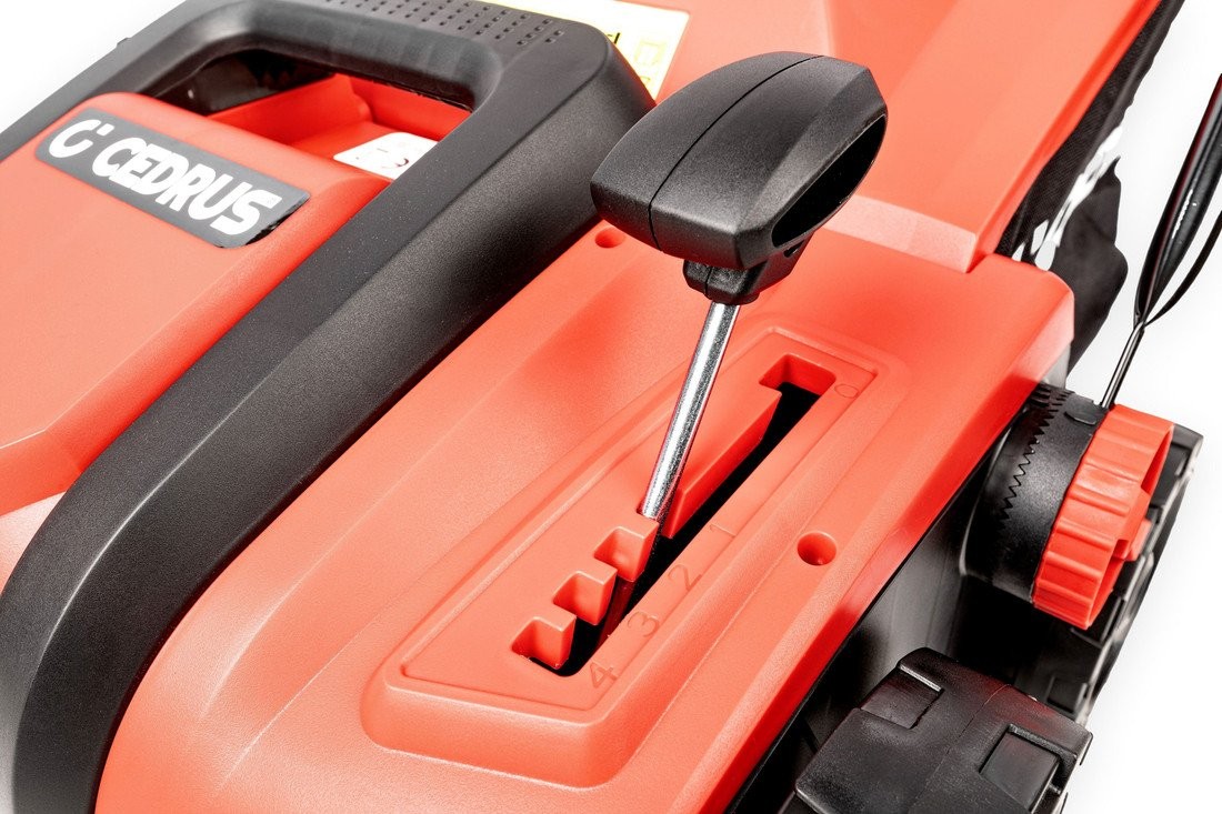 Der Vertikutierer Cedrus CEDWE38 bietet die Möglichkeit, die Arbeitstiefe im Bereich von -12 bis +6 mm einzustellen. Dadurch kann der Benutzer die Intensität der Vertikutierung präzise an die individuellen Bedürfnisse seines Rasens anpassen.