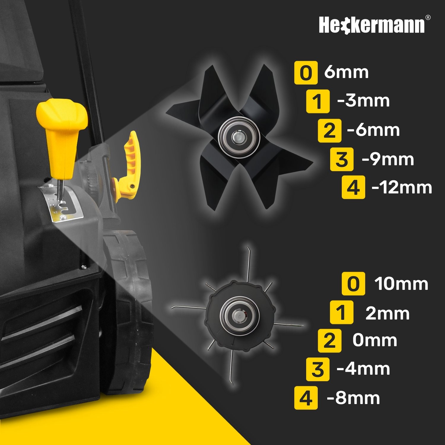Der Vertikutierer bietet eine 5-stufige Einstellung der Arbeitstiefe im Bereich von -12 mm bis +6 mm, wodurch das Gerät perfekt an die individuellen Bedürfnisse Ihres Rasens angepasst werden kann.