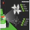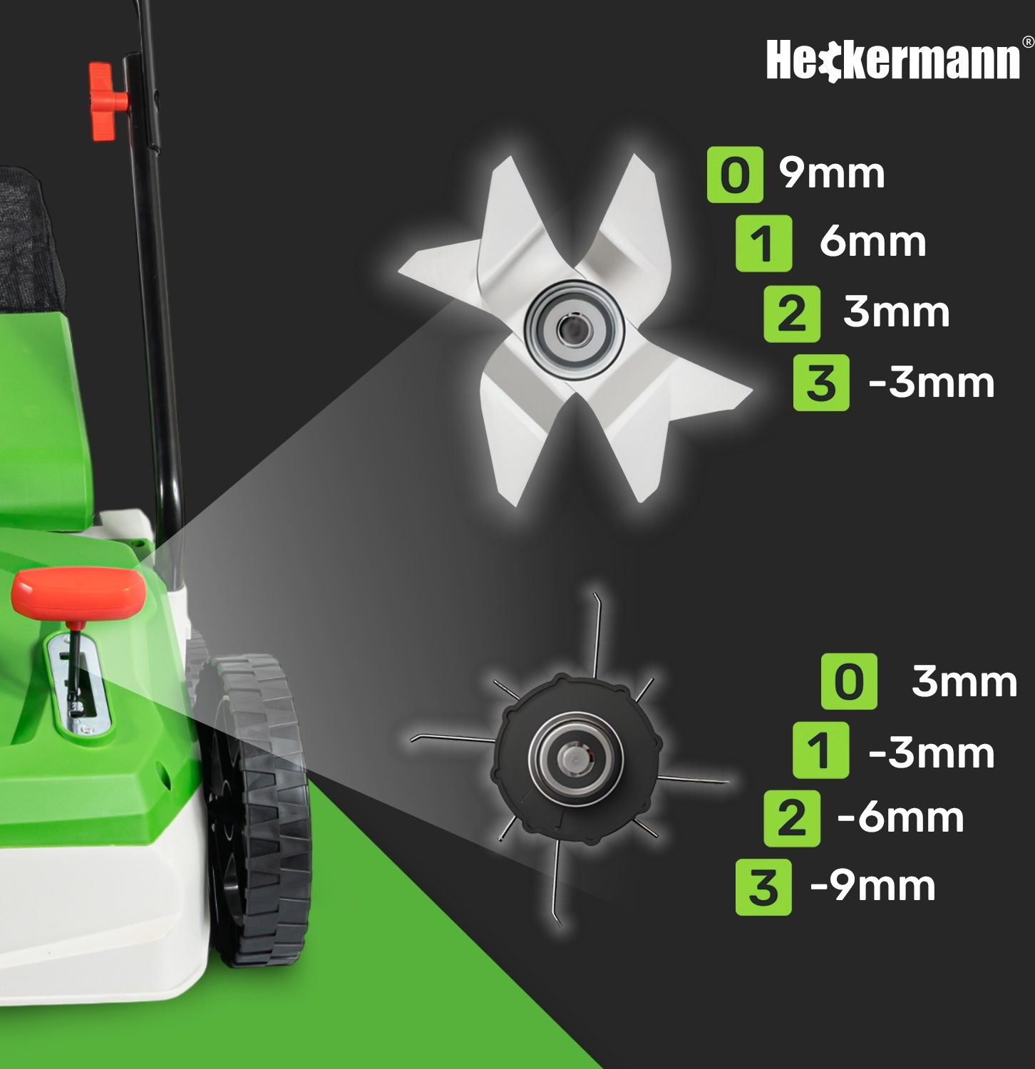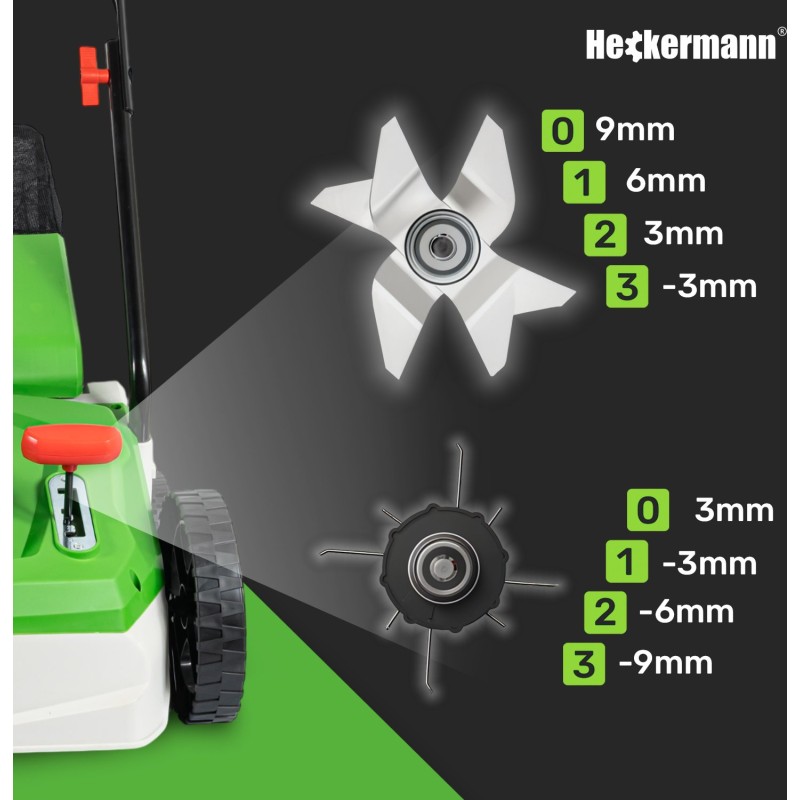 Das Gerät bietet eine 4-stufige Einstellung der Arbeitstiefe im Bereich von -9 mm bis +9 mm. So kannst du die Arbeit des Vertikuters an den aktuellen Zustand des Rasens anpassen und optimale Pflegeergebnisse erzielen.