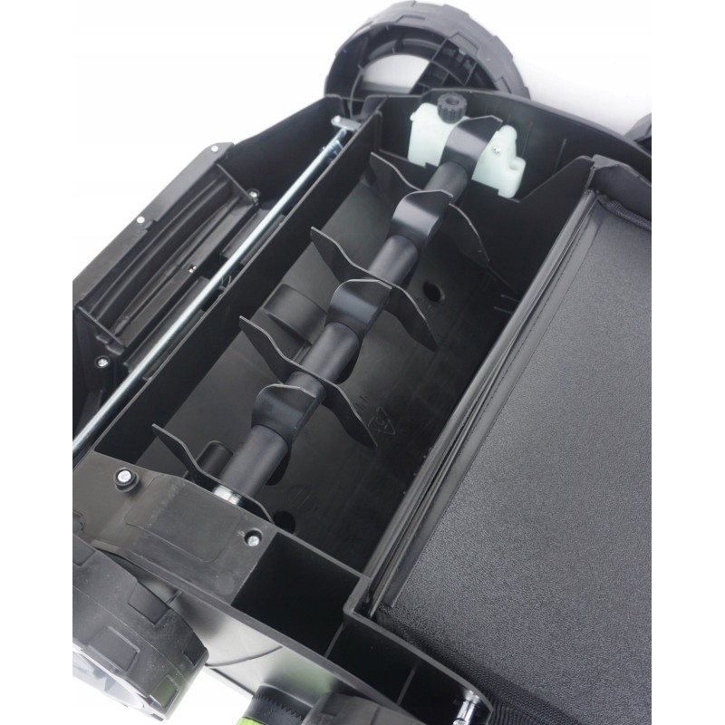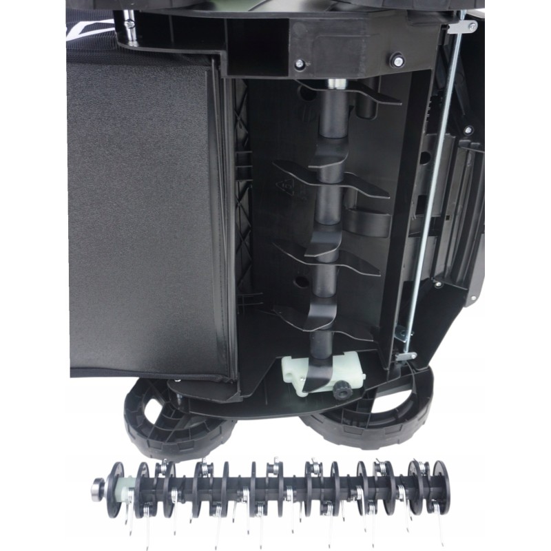 Das Gehäuse aus hochwertigem Kunststoff verbindet Leichtigkeit mit hoher Widerstandsfähigkeit und Langlebigkeit. Das geringe Gewicht der Maschine von nur 12,8 kg garantiert hervorragende Wendigkeit und einfache Handhabung. Diese Lösung werden sicherlich Frauen zu schätzen wissen, die sich nur ungern oder gar nicht an die Arbeit mit einem schweren Benzin-Vertikutierer wagten.