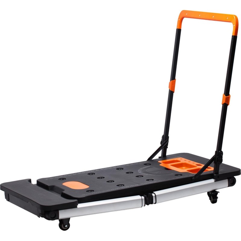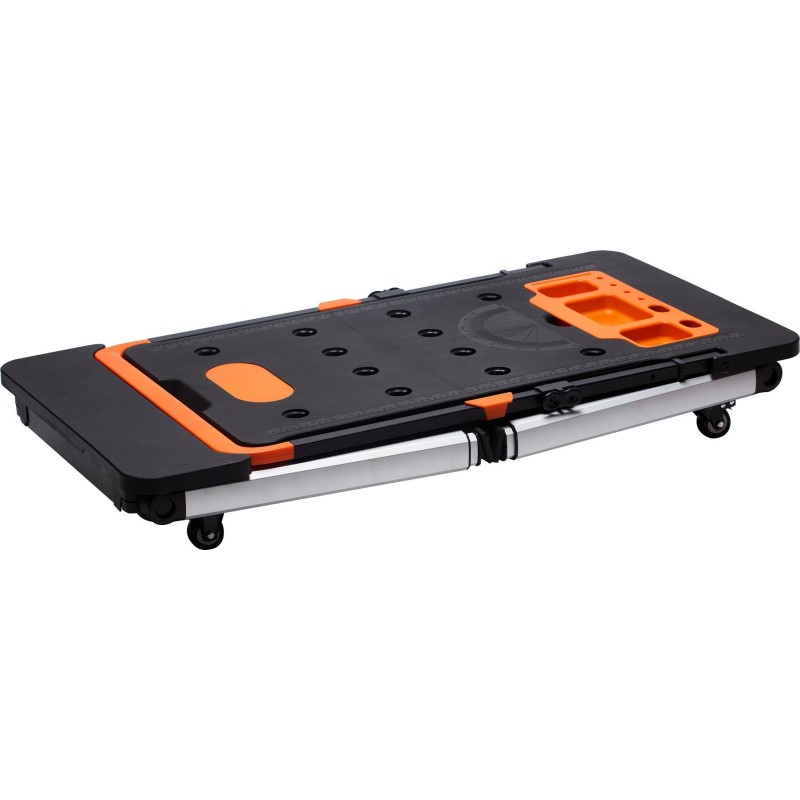 7 Funktionen in einem Gerät: Werkbank, Transportwagen, Gerüst, Arbeitsbühne, Werkbankliege, Fahrgerät, Handwagen.