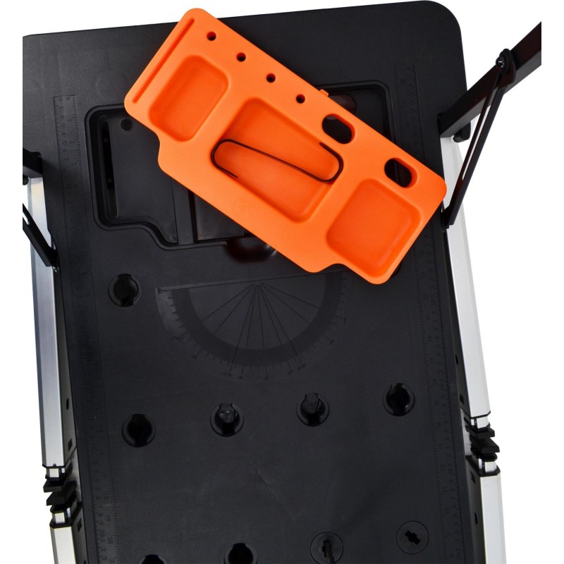 Ausgestattet mit einer Werkzeugablage, einem Winkelmaß, einem Lineal, Öffnungen für Schraubzwingen, einem 2-in-1-Griff sowie einer Zugöse.