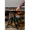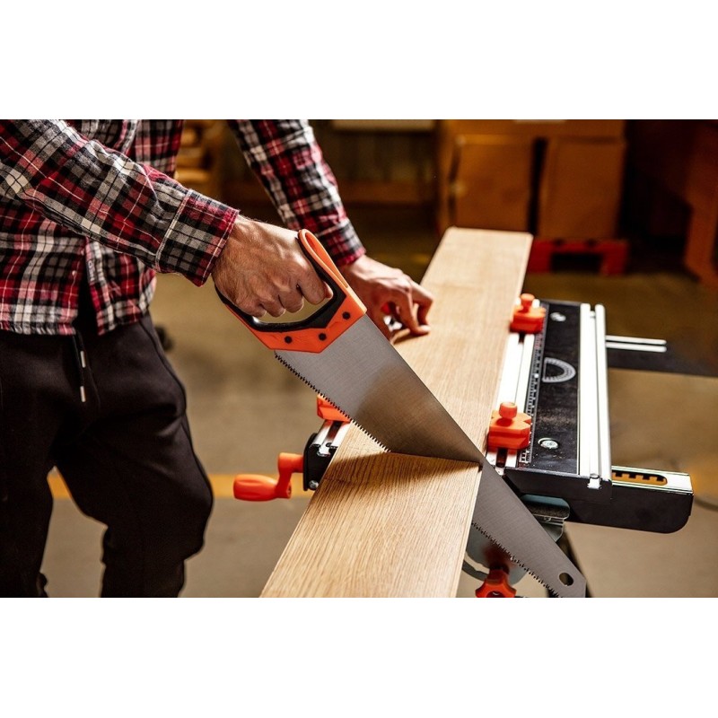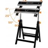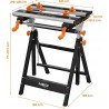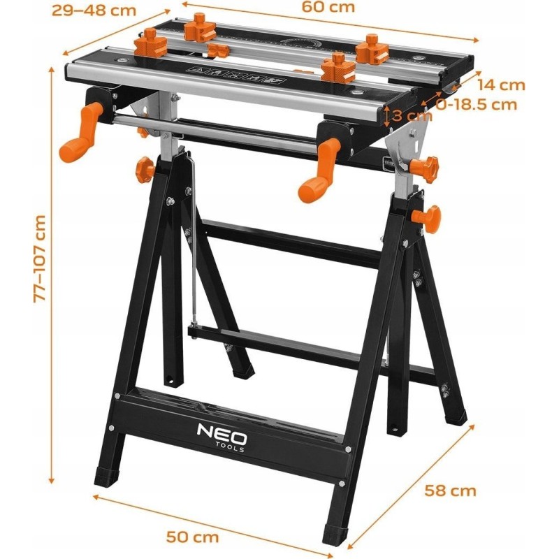 Ausgestattet mit einer Tischplatte, die in 7 Stufen von 77 bis 107 cm höhenverstellbar ist, sowie mit einer Breitenverstellung und einer 4-stufigen Neigungsverstellung (0°, 25°, 50°, 80°). Hergestellt aus Stahl mit Aluminiumprofilen und pulverbeschichtet. Verstärkt durch Metallschrauben, die den beweglichen Teil der Tischplatte führen. Ein Kunststoffgriff erleichtert die richtige Einstellung des Tisches. Zeichnet sich durch kompakte Abmessungen im zusammengeklappten Zustand aus (60 x 29 x 77 cm). Hat eine maximale Belastbarkeit von 100 kg. Er wird im Set mit 4 Kunststoff-Klemmbacken und einem Schraubenschlüssel angeboten. Empfohlen für Heimwerker- und Profi-Werkstätten.