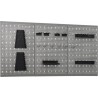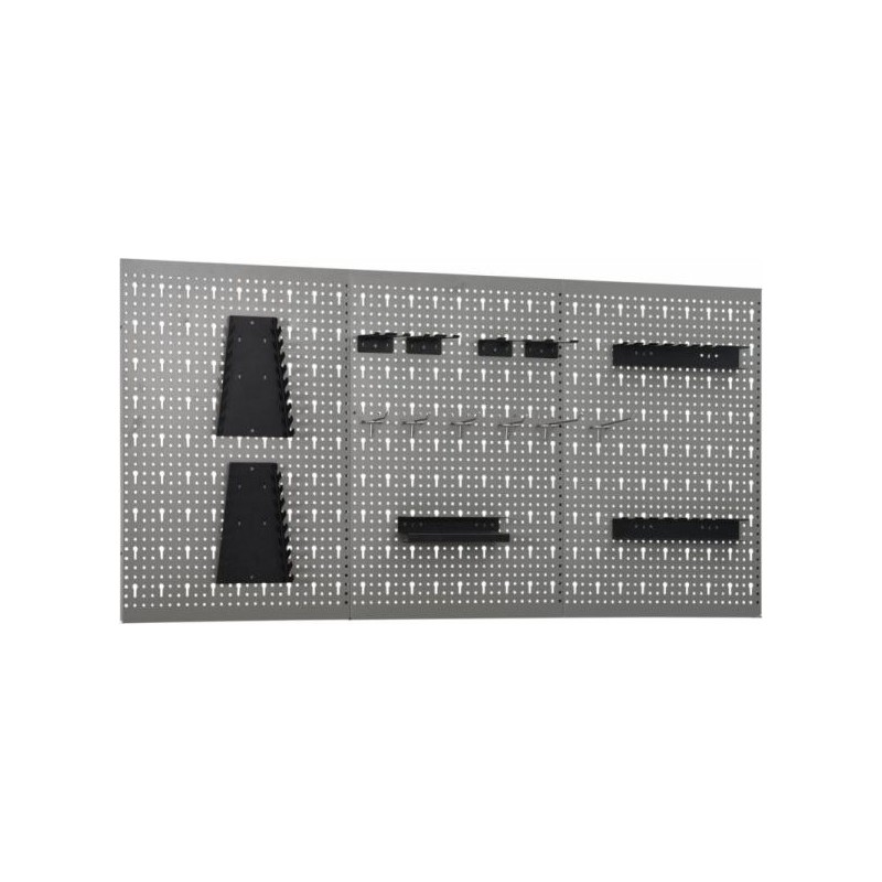 Unsere perforierte Wandplatte sorgt für Ordnung bei Ihren Werkzeugen und macht diese leicht zugänglich. Sie kann in der Werkstatt, in der Garage oder in gewerblichen Räumlichkeiten angebracht werden. Die aus robustem Stahl gefertigten Werkzeugpaneele können das Gewicht verschiedener Werkzeuge wie Bohrmaschinen, Zangen, Schraubendreher und Schraubenschlüssel tragen. Die Platten sind perforiert, damit die Werkzeuge einfach und sicher aufgehängt werden können. Die 3 Paneele können miteinander verbunden werden, um ihre Stabilität zu erhöhen. Mit einer Breite von 120 cm sind sie die ideale Ergänzung für Ihren Arbeitstisch und Ihren Werkstattschrank. Farbe: grau Material: Stahl Abmessungen (Einzelstück): 40 x 58 x 1 cm (L x B x T)Metallstärke: 0,5 mm Durchmesser der kleinen Öffnung: 5,5 mm Abmessungen der Längsöffnung: 9,4 x 22,5 mm (B x H) Verschiedene Öffnungen Passend für einen 120 cm langen Arbeitstisch Lieferumfang: 3 x Lochplatte 15 x Befestigungszubehör...