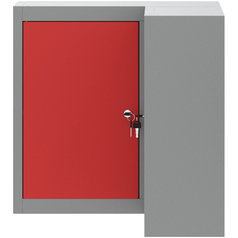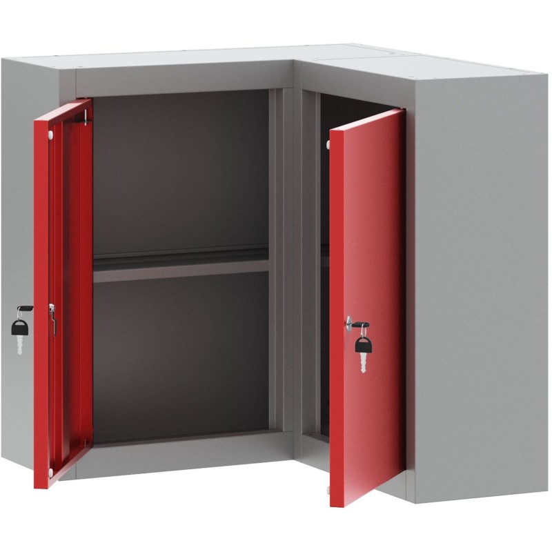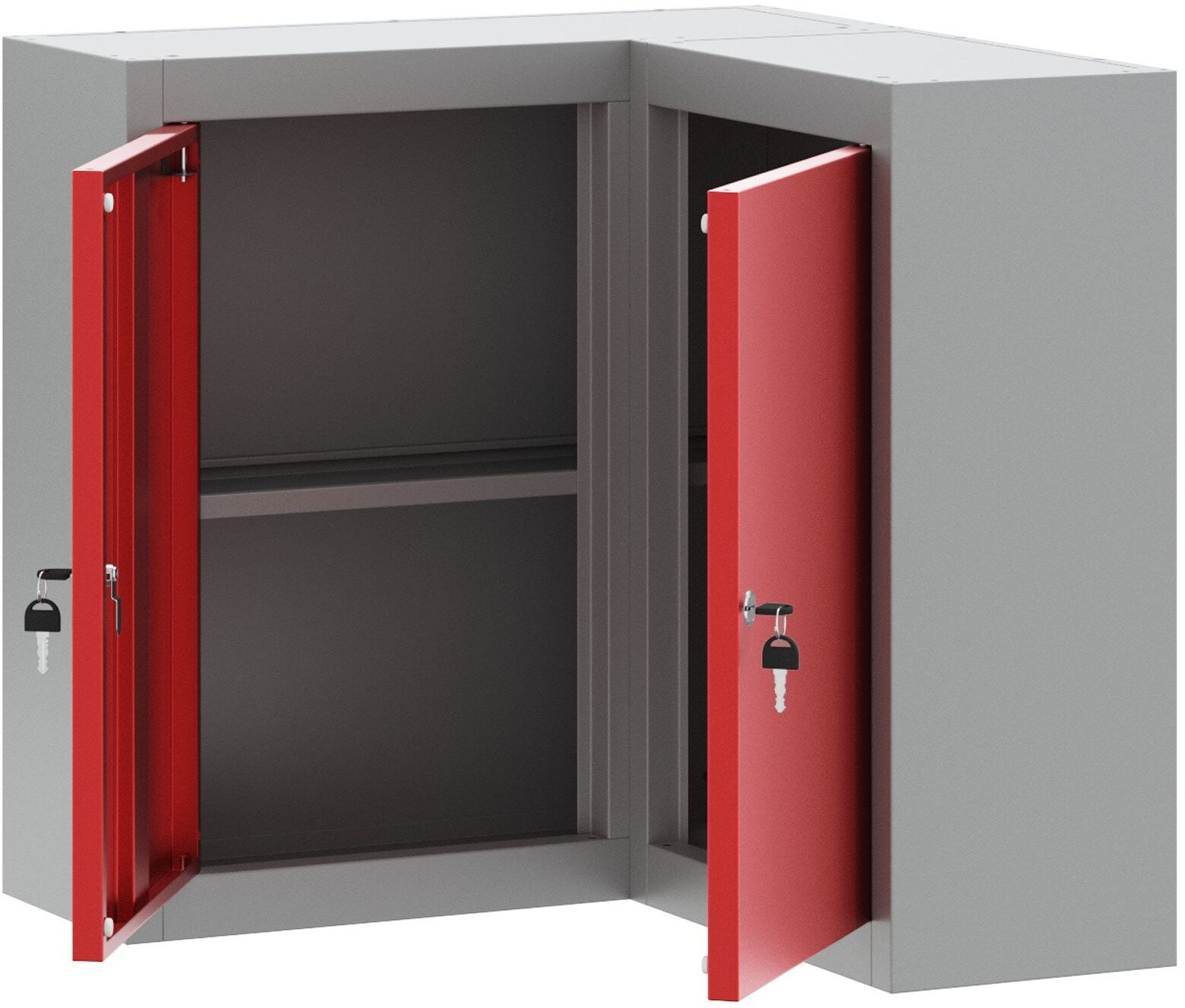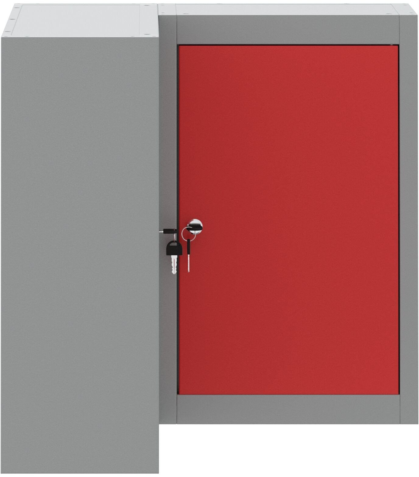 Dieser L-förmige Eckschrank ist eine tolle Möglichkeit, Unordnung in kleinen Räumen in den Griff zu bekommen. Mit seinem modernen Design in Grau aus kaltgewalztem Stahl und roten Akzenten ist er eine coole Wahl für dein Hobbyzimmer, deine Werkstatt oder deinen Balkon.
