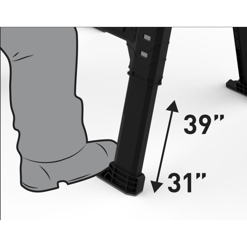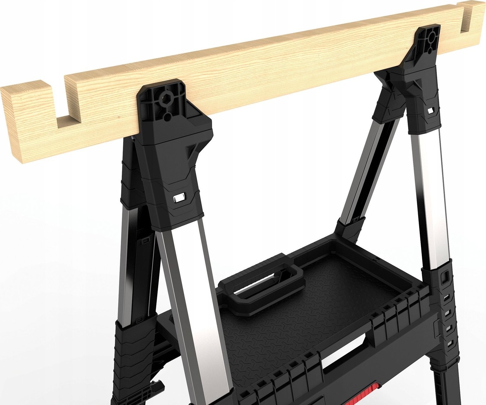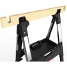Die Metallbeine halten einer Belastung von bis zu 1360 kg (3000 lbs) stand. Die oberen Querstreben verhindern ein unkontrolliertes Herausspringen des Holzes, und die weit ausklappbaren Fußstützen sorgen für Stabilität auch auf unebenem Untergrund und verhindern ein Verrutschen des Ständers während der Arbeit. Die untere Ablage mit einer Tragkraft von 23 kg dient als Aufbewahrungsort für zugeschnittene Holzstücke.