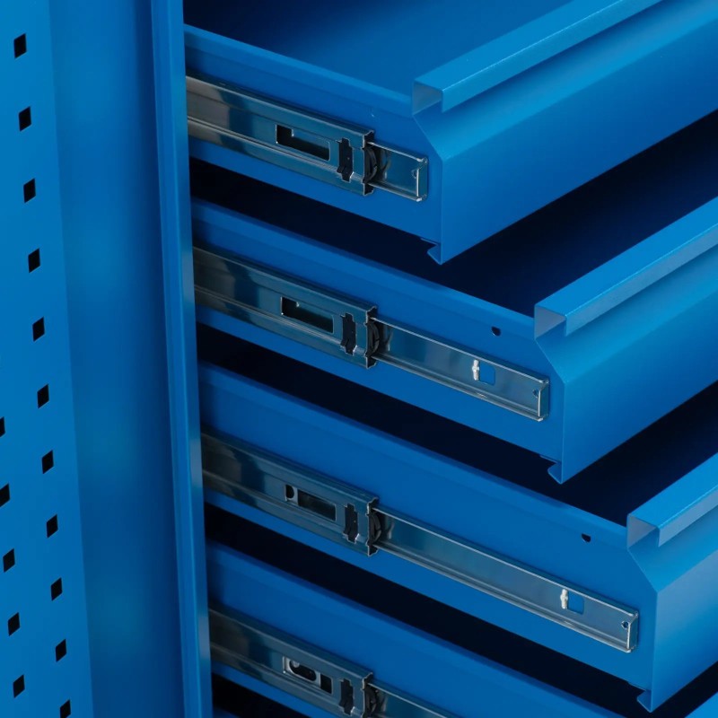 Der Werkzeugschrank der Marke MSW bietet dank seiner kompakten Abmessungen ausreichend Stauraum in der Werkstatt. Ob Schraubendreher, Metallfeilen oder Schrauben – in jeder Werkstatt gibt es viele Dinge, die benötigt werden. Zusätzlichen Stauraum bieten ein Einlegeboden und drei Lochwände. Die Schubladen haben unterschiedliche Größen, sodass sowohl große als auch kleine Gegenstände darin Platz finden. Der Schrank verfügt über 7 Schubladen , die den Stauraum bieten, den jede Werkstatt benötigt. Die Schubladen haben unterschiedliche Größen, sodass sowohl große als auch kleine Gegenstände darin Platz finden. Sie sind zudem äußerst stabil und halten einer Belastung von 45 bis 50 kg stand, weshalb sie sich hervorragend für die Aufbewahrung schwerer Metallgegenstände eignen. Damit ergibt sich eine Gesamtbelastbarkeit von bis zu 350 kg. Das Werkstattmöbel verfügt außerdem über eine perforierte Rückwand und zwei Flügeltüren mit Öffnungen, an denen Werkzeuge platzsparend aufgehängt werden können. Große Geräte können auf dem Regal über den Schubladen abgestellt werden.