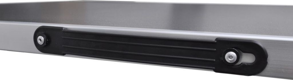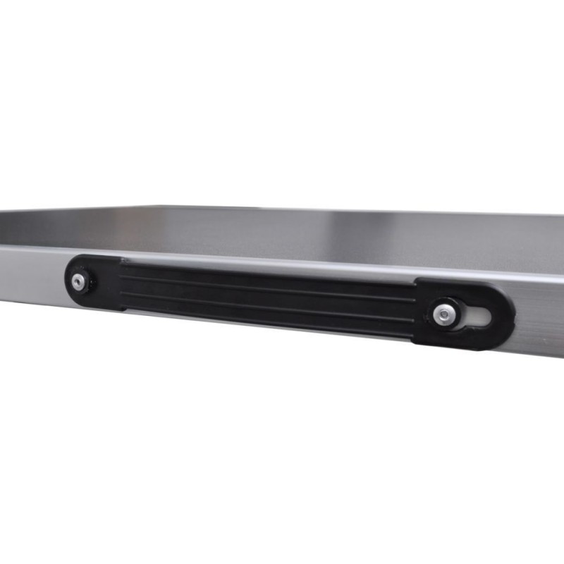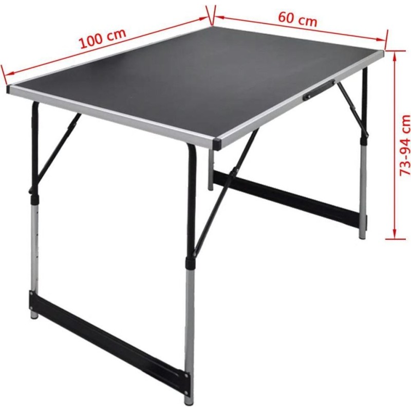 Die leicht zu reinigende, schwarze MDF-Tischplatte wird von Eisenbeinen sowie stabilen, aber leichten Aluminiumbeinen getragen, wodurch das gesamte Set seine Stabilität behält. Die Tische, die bis zu 30 kg tragen können, sind höhenverstellbar: 73, 80, 87 und 94 cm.