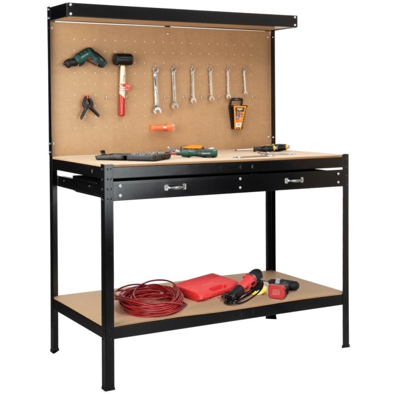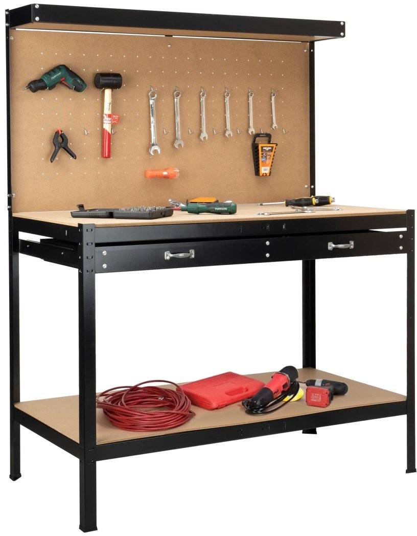 Dank der durchdachten Konstruktion und zusätzlicher Elemente wie der perforierten Werkzeugtafel erleichtert der HORTEN-Tisch die Ordnung in der Werkstatt. Du hast alle Werkzeuge griffbereit, was den Arbeitskomfort erheblich steigert. Dies ist die ideale Lösung sowohl für Heimwerker als auch für Profis.