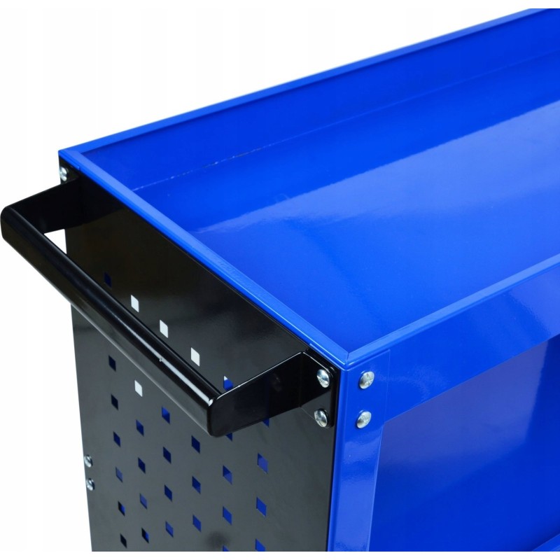 Dies ist ein professioneller, solide gefertigter Werkstattwagen, der Ihnen hilft, Ordnung an Ihrem Arbeitsplatz zu halten. Der Wagen verfügt über einen praktischen Griff, der festgeschraubt werden kann, um den Transport zu erleichtern. Er ist mit drei geräumigen Ablagen und 4 Rädern ausgestattet, davon 2 mit Bremse.