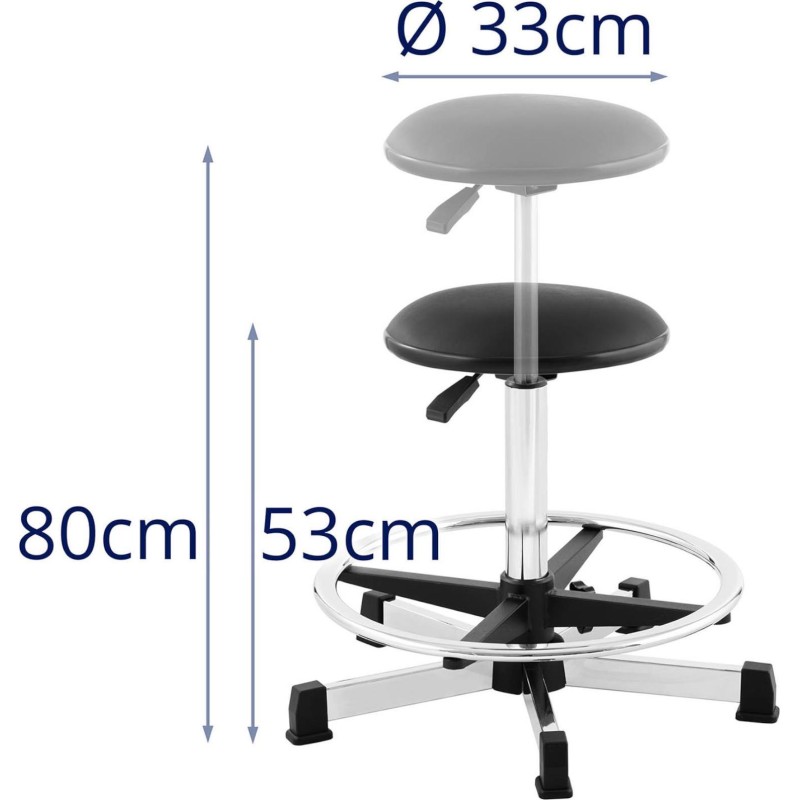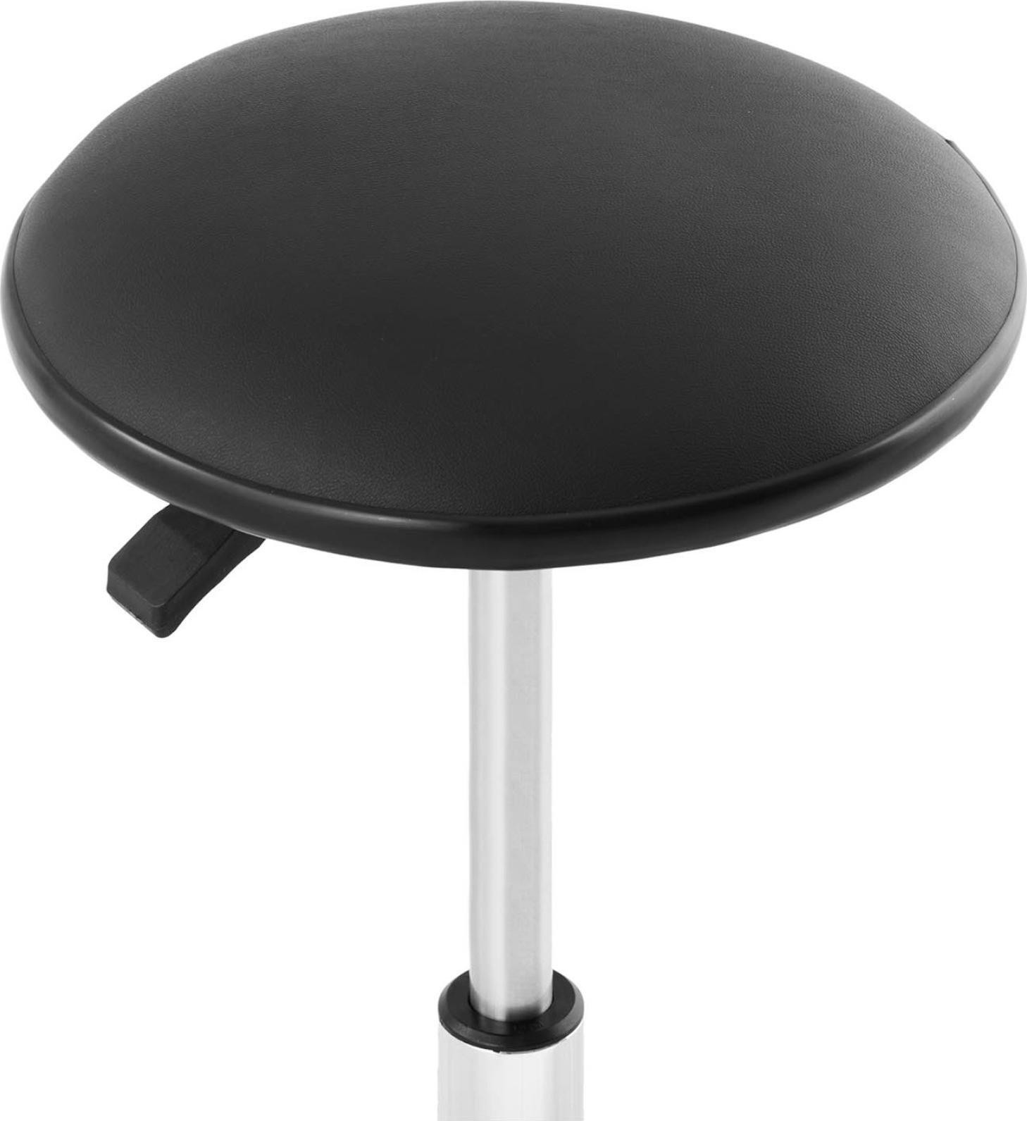 ist bequem, stabil und vielseitig einsetzbar. Er eignet sich ideal für Lager, Werkstätten und Arbeitsräume. Der Hocker verfügt über eine große Sitzfläche mit einem Durchmesser von 33 cm . Die robuste Konstruktion hält einer Belastung von bis zu 120 kg stand. Die Höhe des Hockers lässt sich über einen Hebel unter der Sitzfläche im Bereich von 530 bis 800 mm verstellen. Eine Fußstütze aus Stahlrohr bietet zusätzlichen Halt für die Füße.