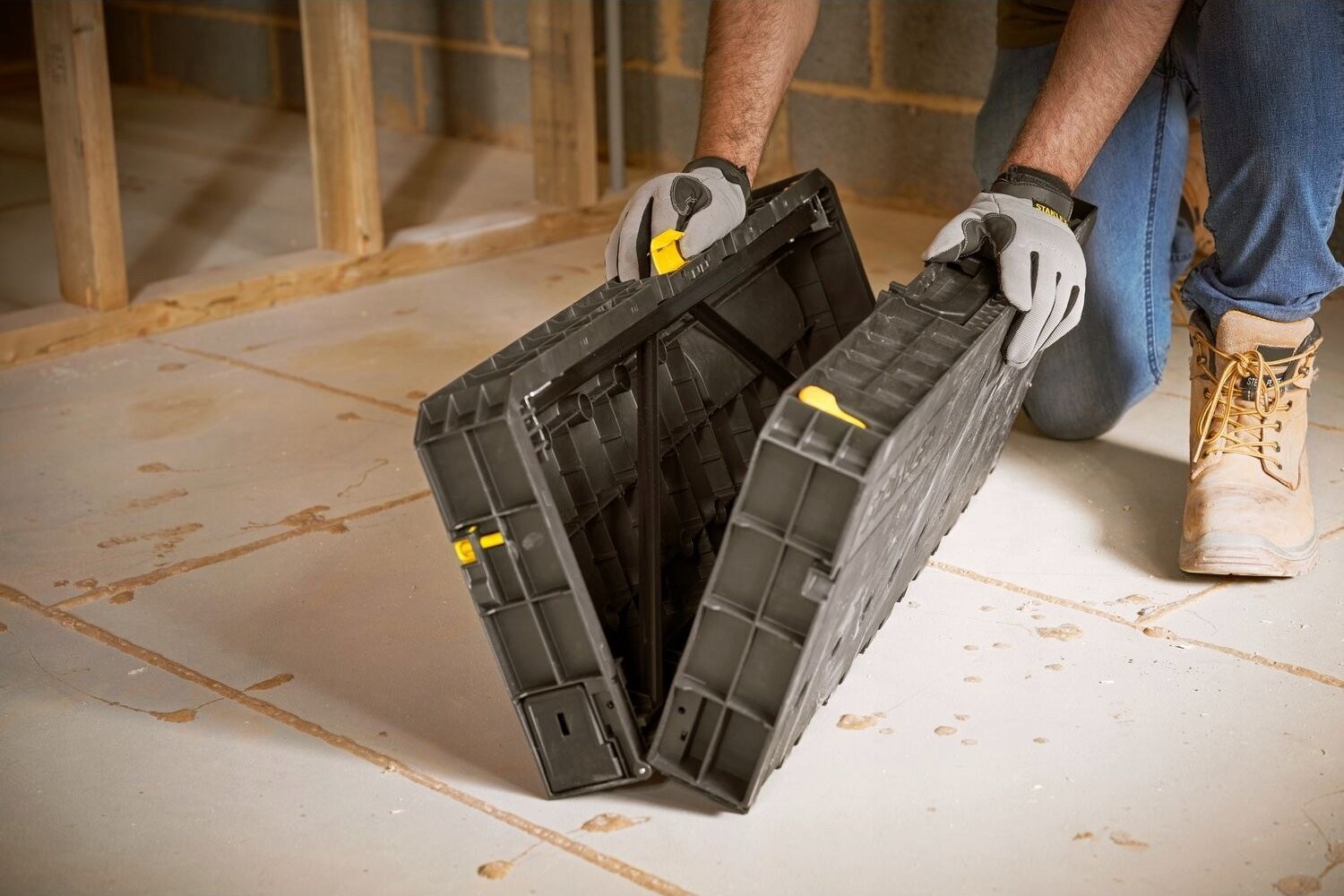• Der klappbare STANLEY® Fold-Up-Werkbanktisch kann in Kombination mit dem STANLEY® Metal Sawhorse verwendet werden, was das sichere Schneiden und Bearbeiten größerer Materialien ermöglicht