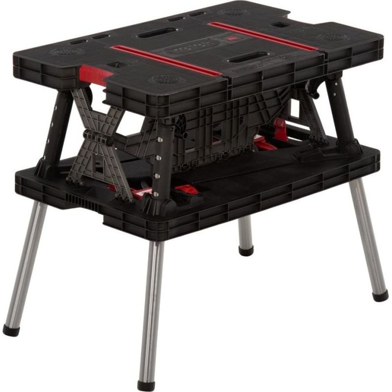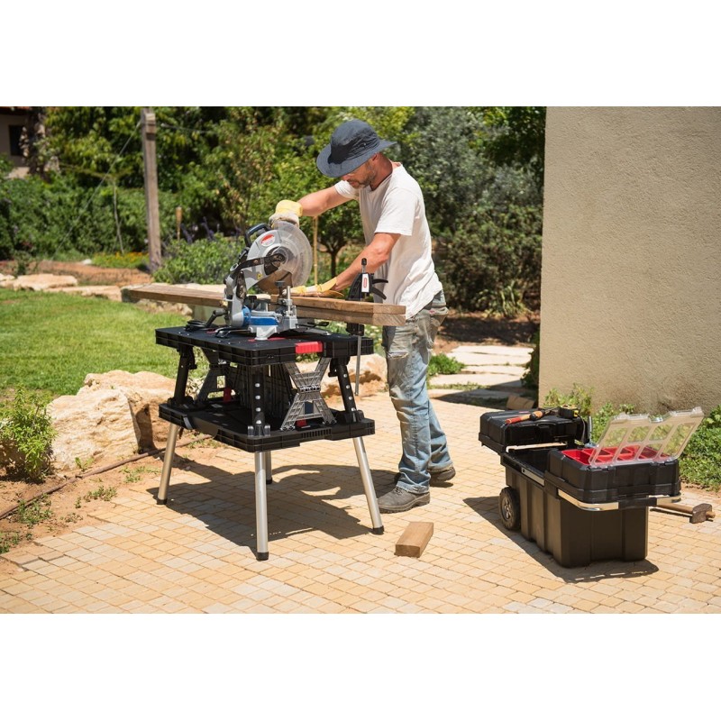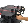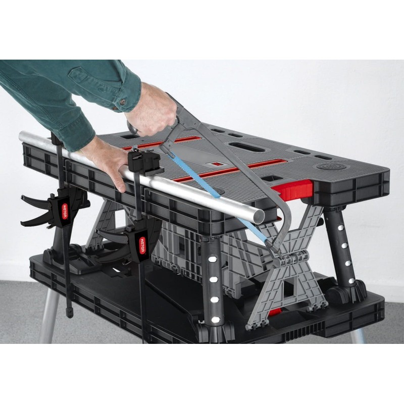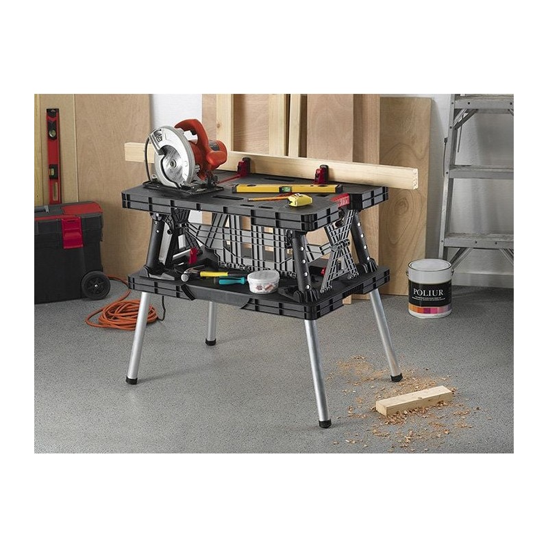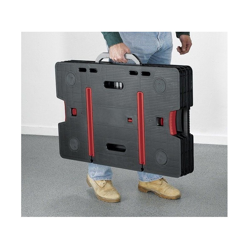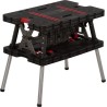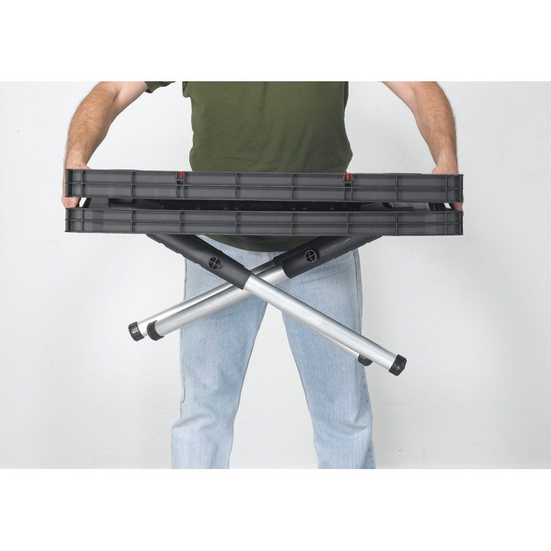 Praktischer Tisch, geeignet für den Einsatz unter verschiedenen Bedingungen. Die universelle, tragbare Konstruktion ist mit einem System ausgestattet, das ein schnelles Auf- und Zusammenklappen ermöglicht. Die große Arbeitsfläche des Tisches mit einer Tragkraft von bis zu 453 kg/1000 lbs ermöglicht auch anspruchsvolle Arbeiten. Im Lieferumfang sind zwei 30 cm/12” lange Klemmen enthalten, die für Stabilität der Arbeitsfläche und sicheren Betrieb sorgen.