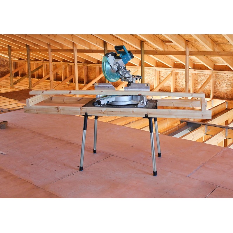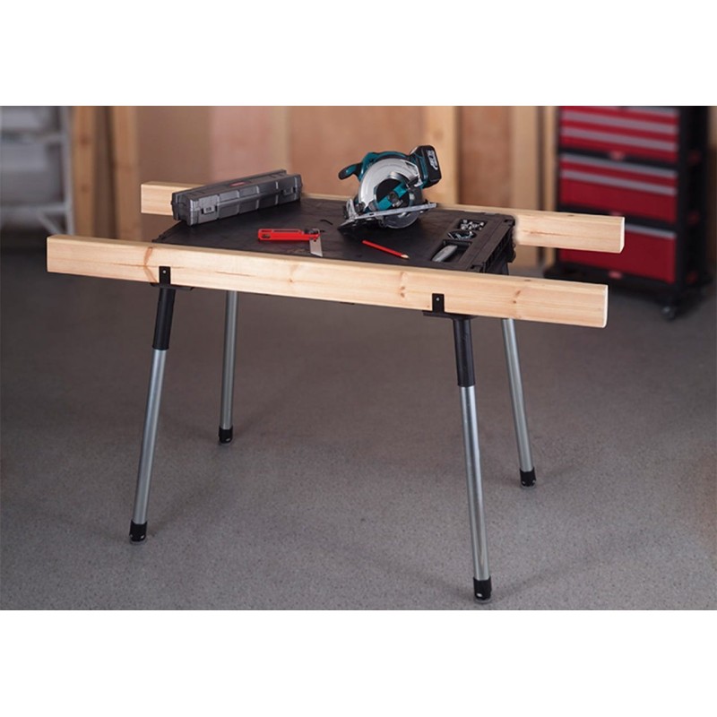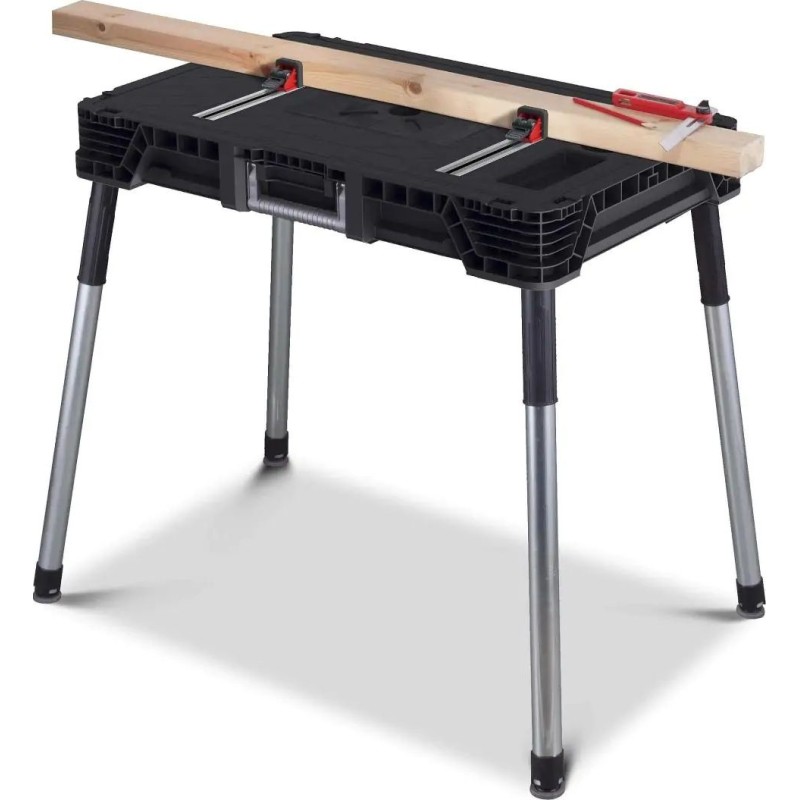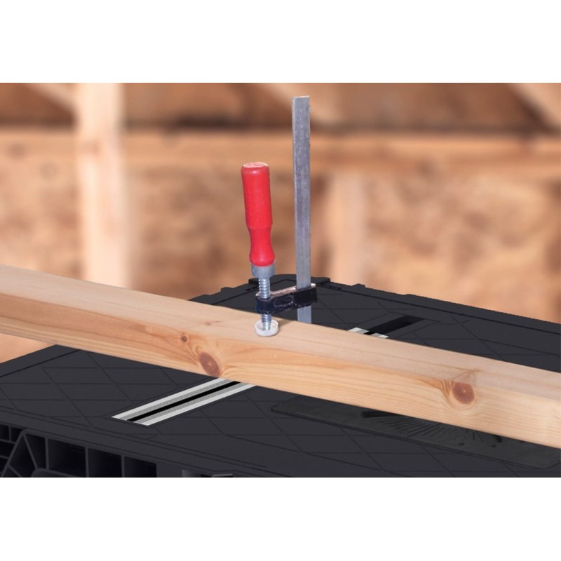 Mit dem Jobmade-Tisch kannst du nicht nur zu Hause oder in der Garage arbeiten. Dank seiner leichten Konstruktion und dem geformten Griff kannst du ihn problemlos überallhin mitnehmen. Die Arbeitsstation verfügt über 4 Halterungen, sogenannte Klemmen, die in den Führungen der Tischplatte befestigt werden. So kannst du problemlos eine zusätzliche Platte anbringen und damit deine Arbeitsfläche vergrößern. Mit Hilfe der Halterungen kannst du die Größe deines Tisches anpassen.