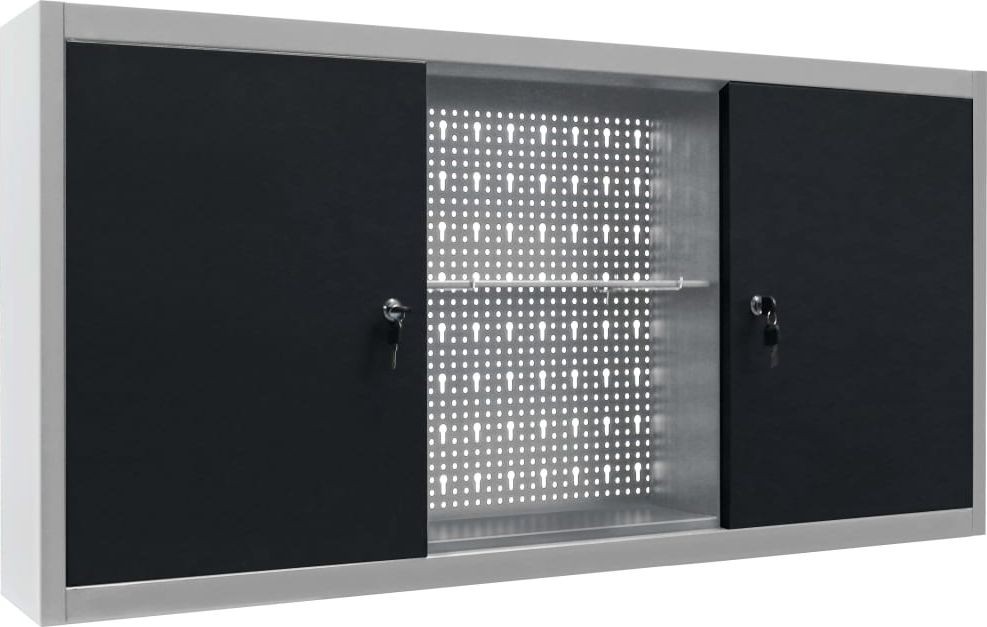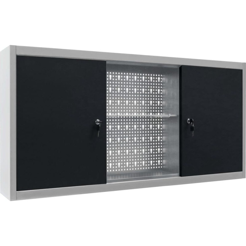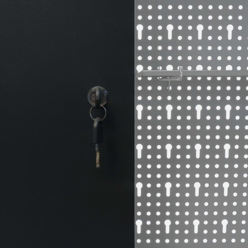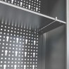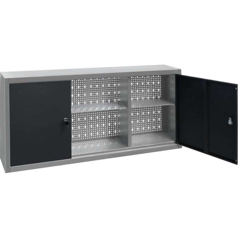 Der Schrank verfügt über drei höhenverstellbare Einlegeböden und eine perforierte Platte mit Euro-Löchern, an der verschiedene Werkzeuge wie Schraubenschlüssel, Zangen, Hämmer usw. aufgehängt werden können. Ausgestattet mit zwei abschließbaren Türen (je 2 Schlüssel pro Tür sind im Lieferumfang enthalten) bietet der Schrank zusätzliche Sicherheit. Die Metallkonstruktion mit einer besonders robusten, kratzfesten Beschichtung macht das Möbelstück strapazierfähig und leicht zu reinigen. Das Produkt muss zusammengebaut werden.