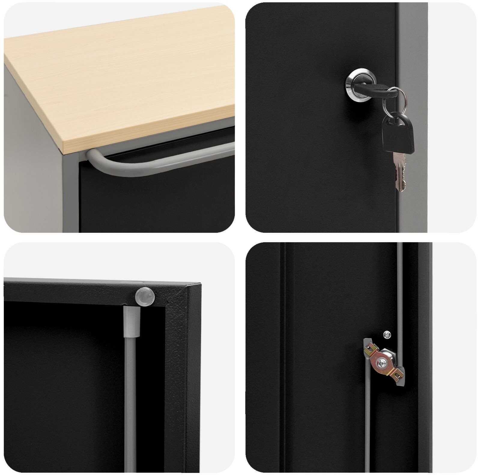 • Robuste Konstruktion: Hergestellt aus robustem Stahl und Holzwerkstoffen, hält dieser Schrank auch anspruchsvollen Bedingungen stand, was ihn zu einer guten Wahl macht.