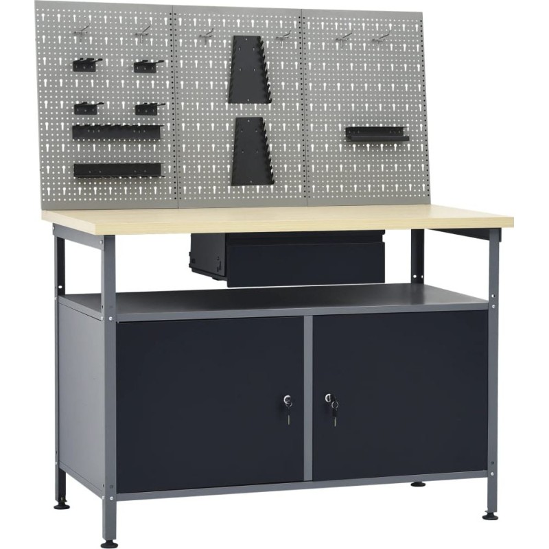 Der Werkbanktisch zeichnet sich durch viel Stauraum und eine maximale Tragkraft von 300 kg aus. Er verfügt über ein offenes Fach mit einer Schublade, in dem Sie Ihre Werkzeuge, Teile und Zubehör wie Schrauben, Nägel und Klebebänder ordentlich verstauen können. Außerdem umfasst er 2 Ablagen und einen großen Stauraum für größere Werkzeuge mit 2 abschließbaren Türen, in denen Sie Bohrmaschinen, Kabeltrommeln und Schleifmaschinen bequem unterbringen können. Zudem sind die Tischbeine höhenverstellbar. Dieses Arbeitstischmodell wurde aus hochwertigem Stahl und Spanplatten gefertigt und gewährleistet so außergewöhnliche Festigkeit, Langlebigkeit und einfache Reinigung. Die Montage ist unkompliziert.