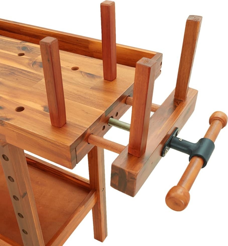 • Stabilität: Der Arbeitstisch ist mit 1 vorderen und 1 hinteren Schraubzwinge ausgestattet, einschließlich 4 Holzstangen zur stabilen und sicheren Befestigung von Gegenständen.