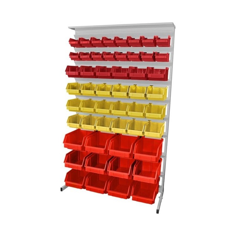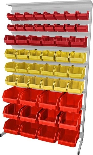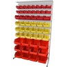 Leomar Regal für Werkstattbehälter, einseitig. Die Abmessungen des Regals betragen 1560 x 940 x 400 mm. Es verfügt über eine Ablage und 52 Behälter in den Farben Rot und Gelb.