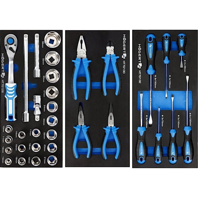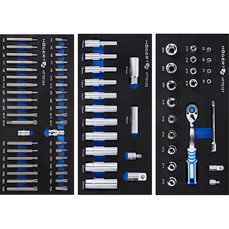 • Einsatz HT7G128 Ratschensatz 1/2”, 23-teilig (Steckschlüsseleinsätze HT1A210–HT1A236, Ratsche 1/2” HT1R322, Drehknopf 254 mm HT1A727, Verlängerung 1/2” 127 mm HT1A724, Gelenk 1/2” HT1A757)