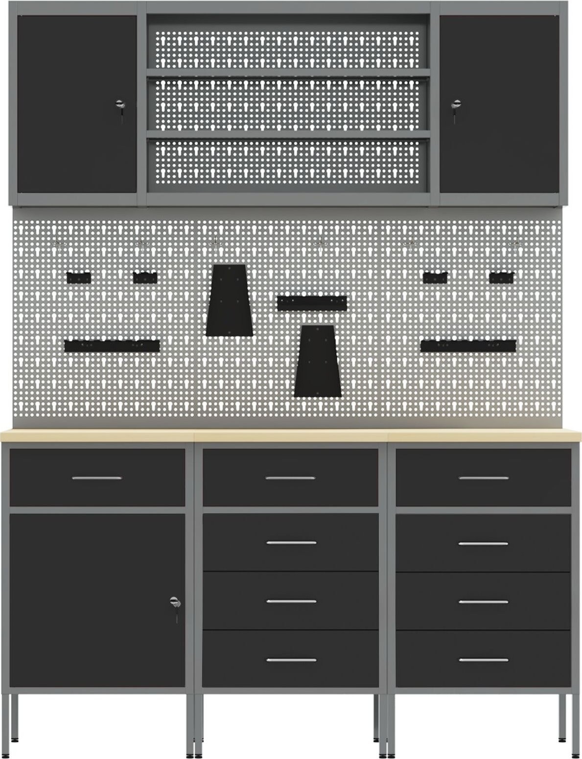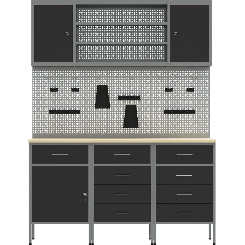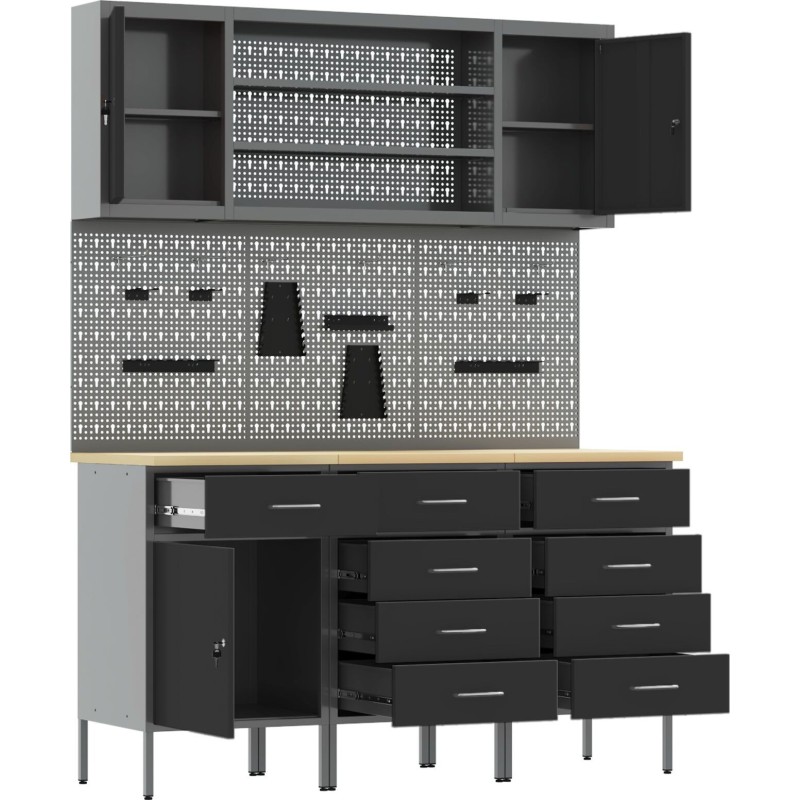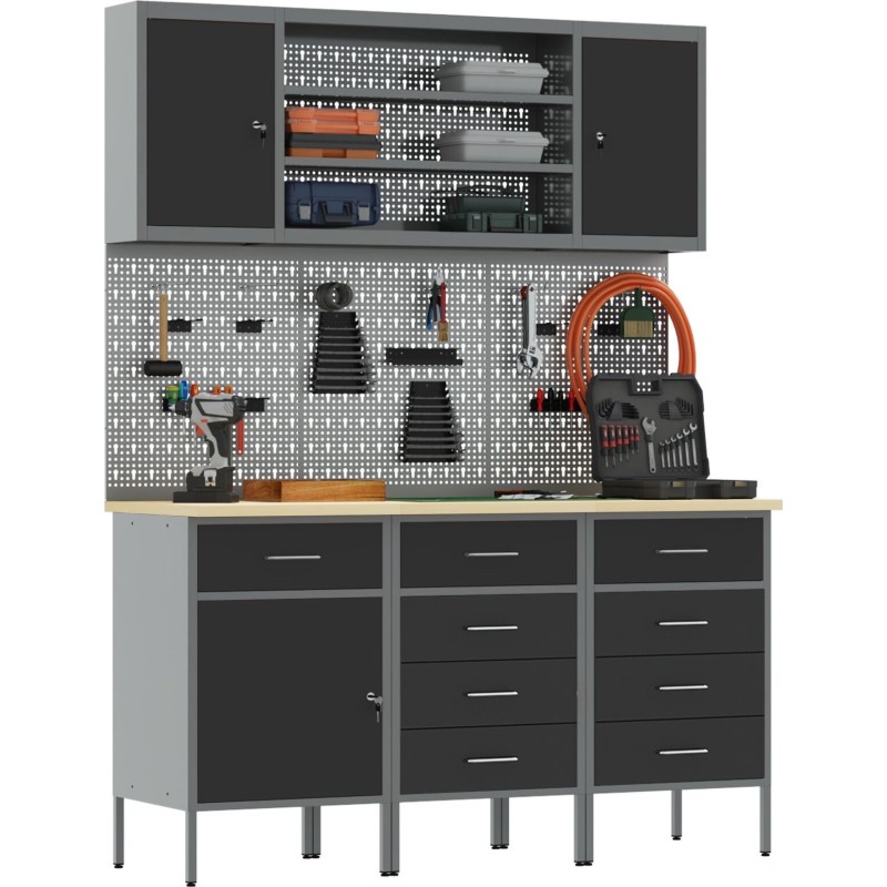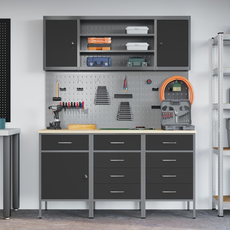 Dieser Werkstattschrank im Industrial-Stil eignet sich hervorragend zur Organisation von Werkzeugen und des Arbeitsbereichs. Er besteht aus robustem Stahl und Holzwerkstoff, ist langlebig und ansprechend gestaltet, was ihn zu einem unverzichtbaren Bestandteil jeder Garage oder Werkstatt macht. Die stilvolle, matte Oberfläche und die Arbeitsplatte in Holzoptik verleihen ihm Eleganz, fügen sich hervorragend in die Einrichtung Ihres Zuhauses ein und sind gleichzeitig funktional.