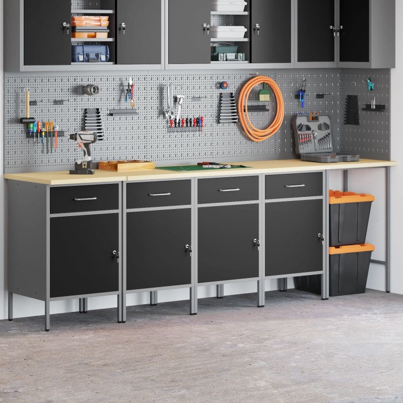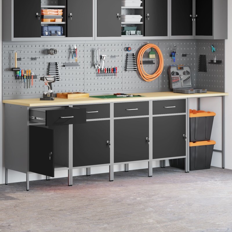 Dieses multifunktionale Set aus Arbeitsschränken und einem Ecktisch wurde entwickelt, um all deine Anforderungen an Aufbewahrung und Organisation zu erfüllen, ganz gleich, ob du Profi bist oder gerade erst anfängst. Es besticht durch seinen coolen Industrial-Stil und bietet einen soliden Arbeitsplatz sowie reichlich Stauraum – ideal für alle, die Ordnung in ihrer Garage oder Werkstatt schaffen möchten.