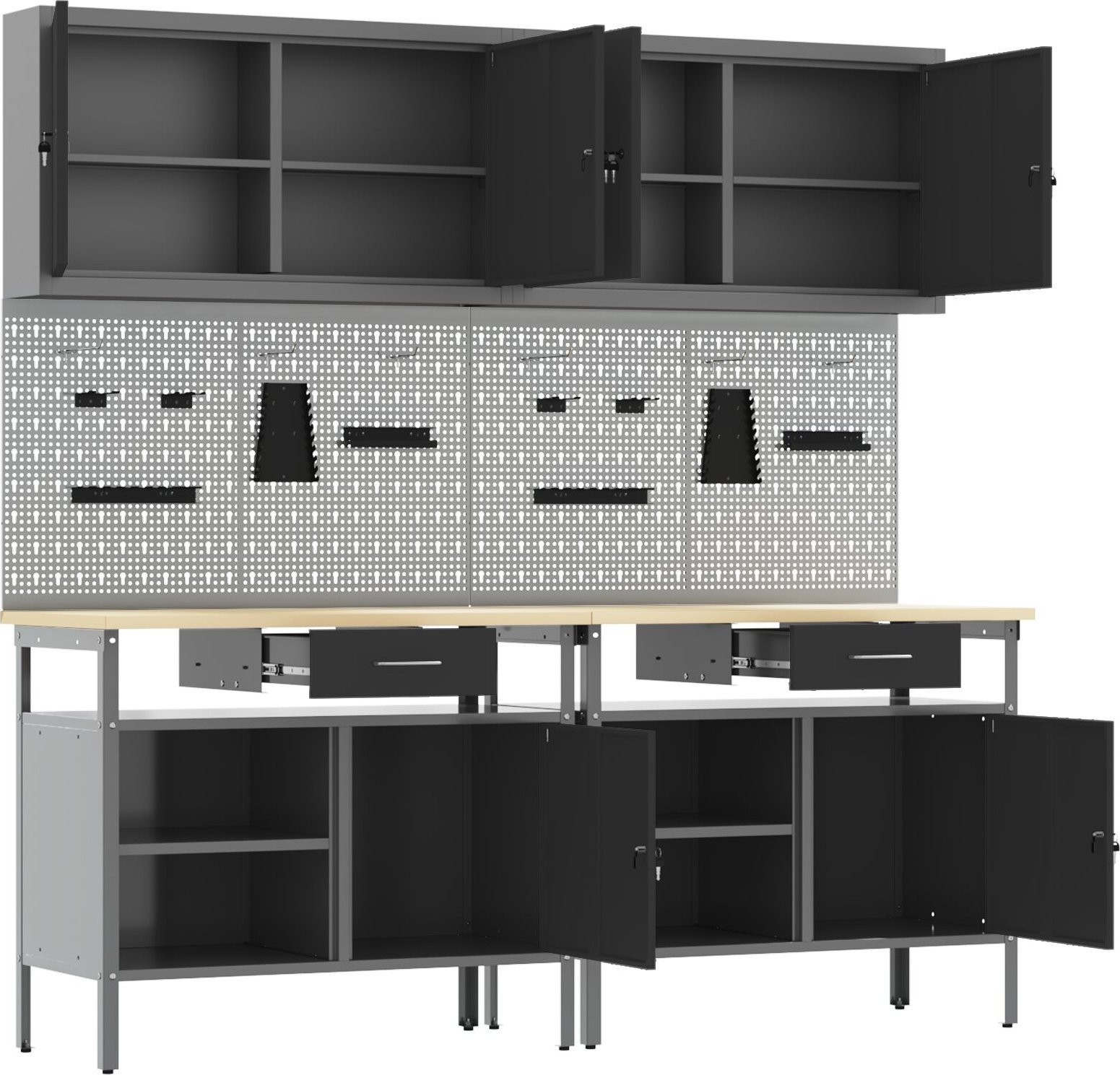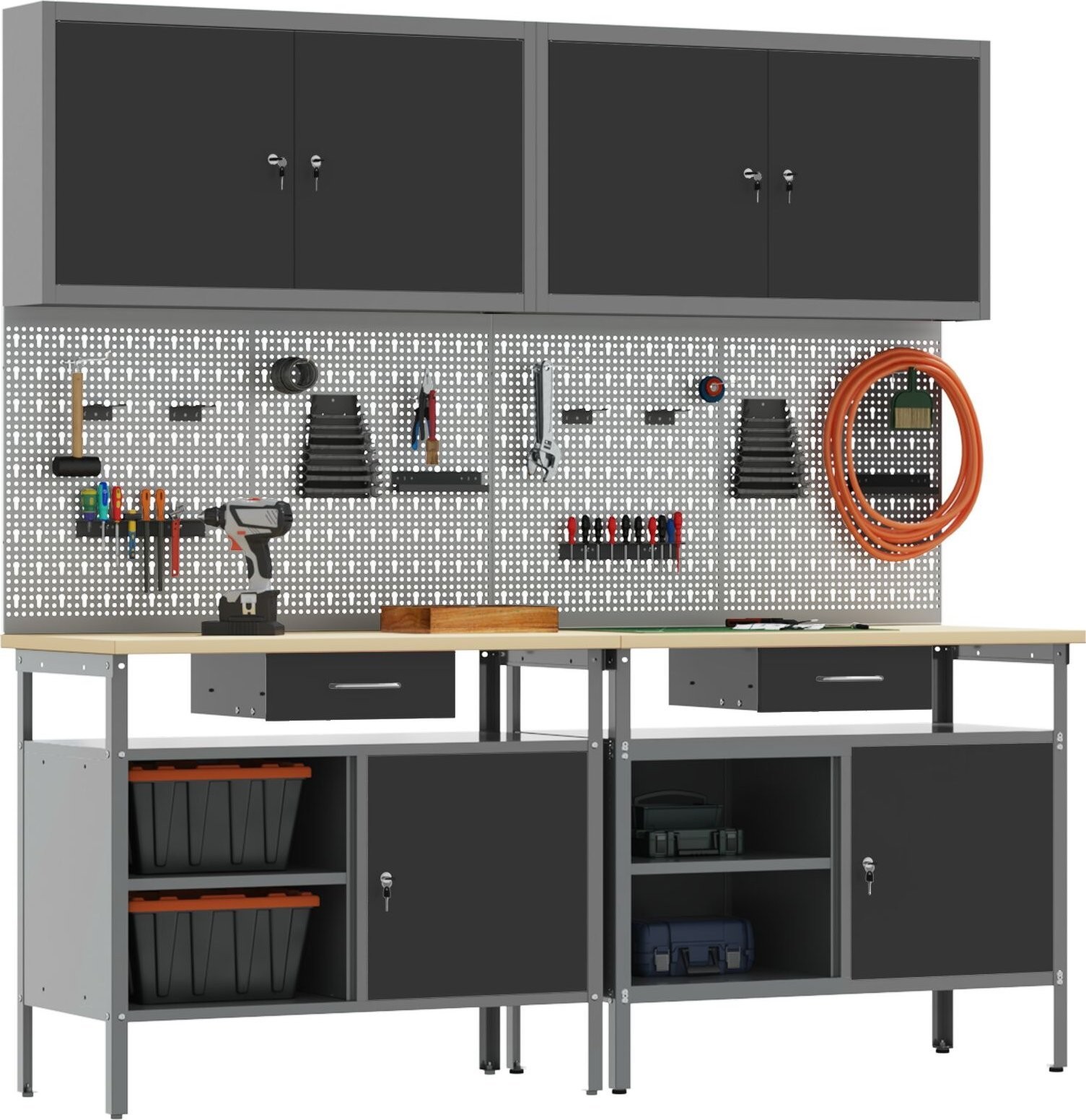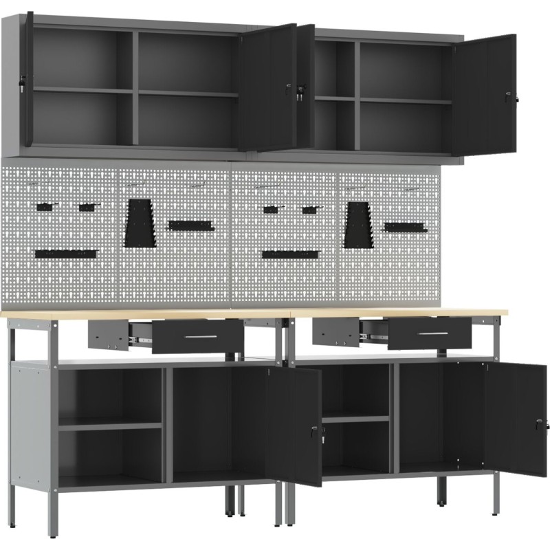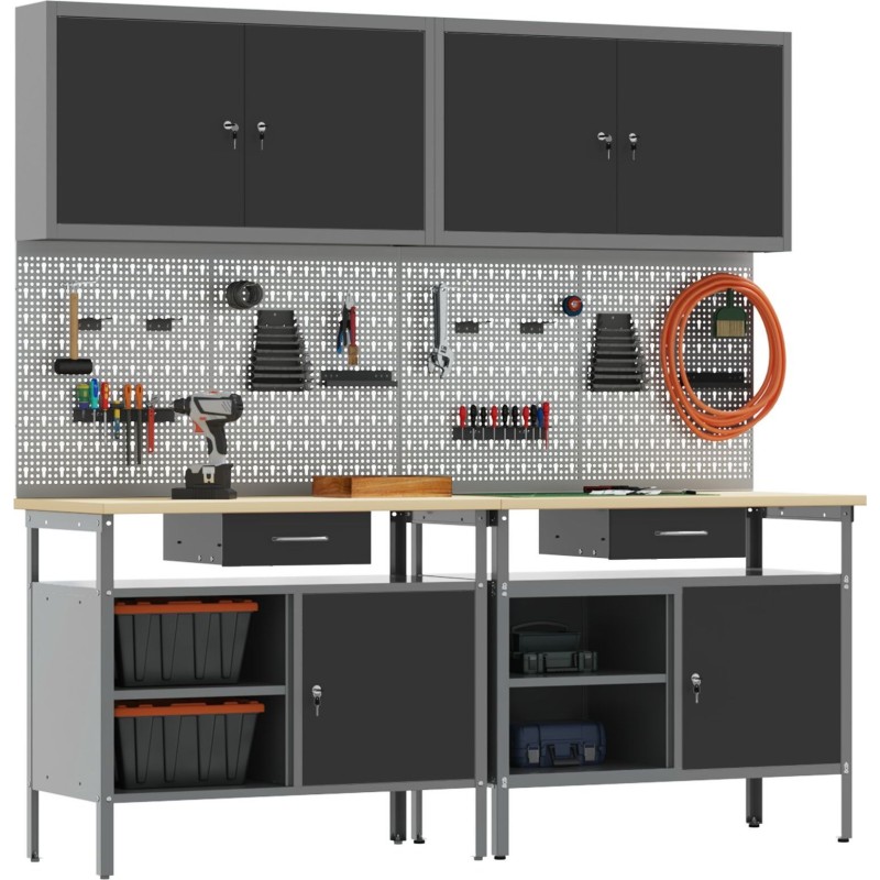 • Vielfältige Aufbewahrungslösungen: Dieses Set umfasst 2 stabile Haken, 4 Lochplatten und 2 Schränke zur Organisation von Werkzeugen und Ausrüstung. Alles ist so konzipiert, dass der Platz optimal genutzt wird, sodass alles griffbereit ist.