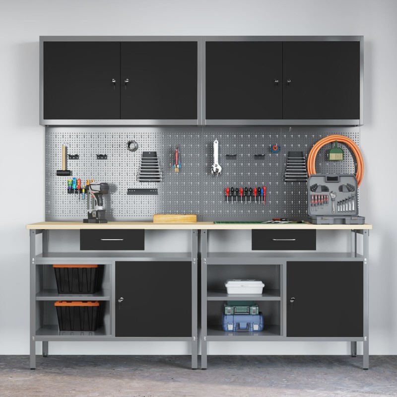 • Vielseitiges Design: Der graue und schwarze Stil passt zu fast jedem Interieur, und sein industrieller Look fügt sich perfekt in Werkstätten und Garagen ein. Ideal für Profis oder alle, die einen soliden Platz für ihre Werkzeuge benötigen.