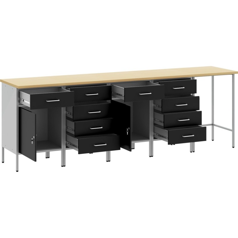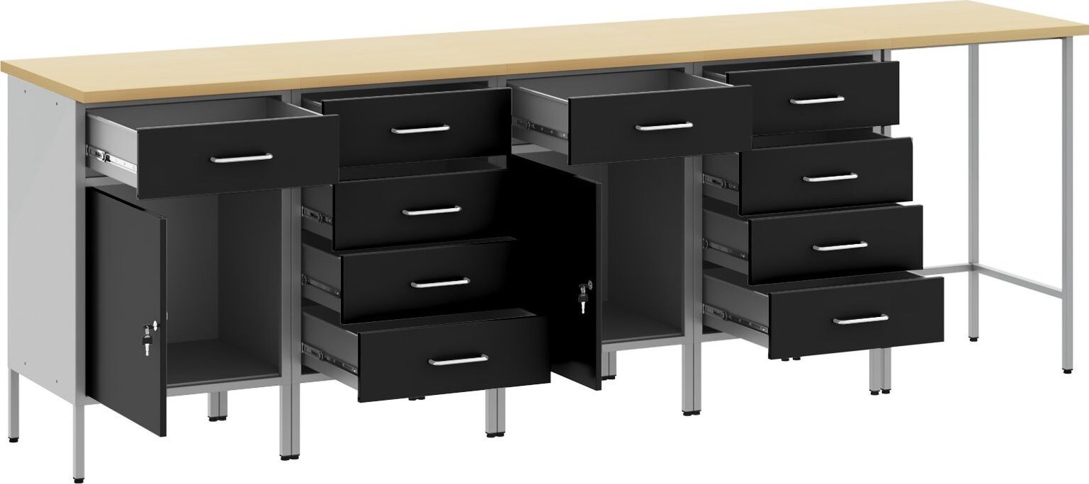 • Zwei Stauräume: Mit einer geräumigen Arbeitsplatte und zahlreichen Schubladen, darunter eine mit glatten Schienen, sowie abschließbaren Türen ist dies eine hervorragende Lösung für Ihre Werkzeuge. Einfacher Zugriff auf alles, was Sie brauchen, von Schraubenschlüsseln bis hin zu Handwerksmaterialien.