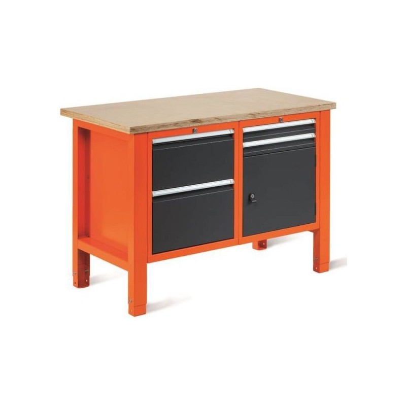 Werkbank mit folgenden Eigenschaften:Höhe: 850–900 mmBreite: 1245 mmTiefe: 620 mmGewicht: 80 kgArbeitsplatte – BGestell – BSchrank – ASchrank – TZulässige Höchstbelastung der zweimoduligen Werkbank = 450 kg