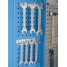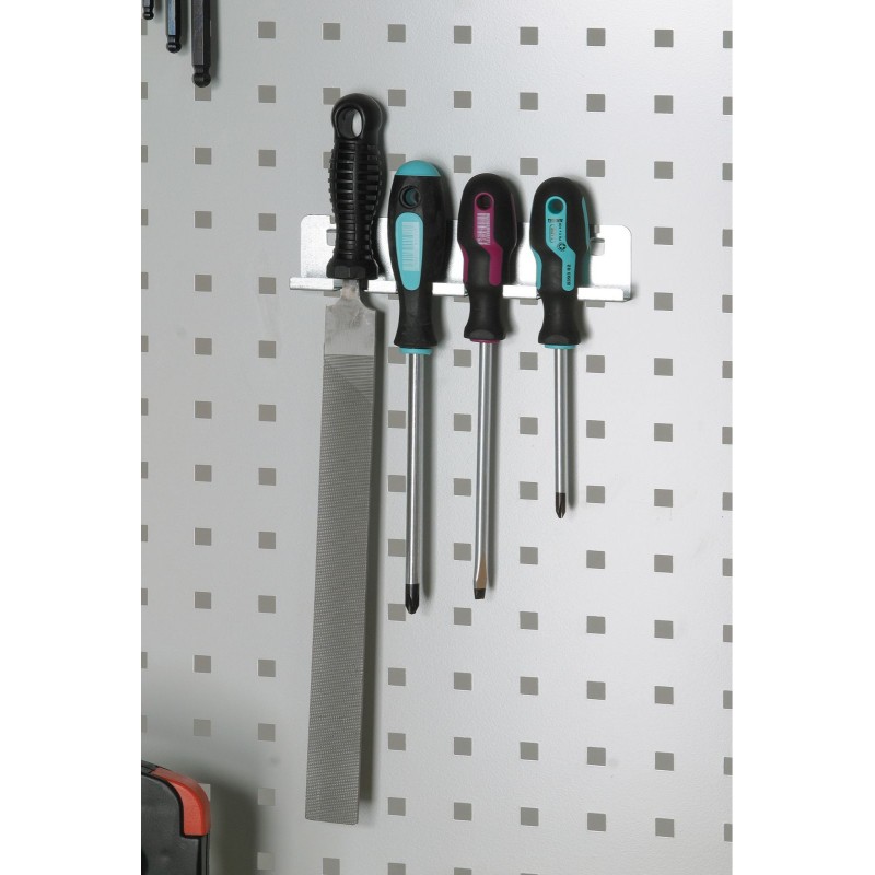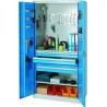 Ein vielseitiger, robuster Werkstattschrank mit Schubladen zur Aufbewahrung von Werkstattwerkzeugen. Der große, geräumige Schrank ist zusätzlich mit Lochblechen ausgestattet, die die Verwendung von Haken zum Aufhängen von Werkzeugen ermöglichen. Ein Patentverschluss mit zwei Riegeln schützt den Inhalt vor dem Zugriff Unbefugter. Die Schranktüren sind im mittleren Bereich über die gesamte Höhe verstärkt .