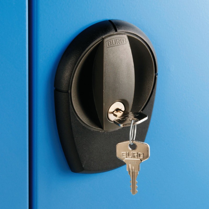 Der Schrank ist vollständig aus hochwertigem Stahlblech gefertigt, dauerhaft verschweißt und mit widerstandsfähiger Pulverbeschichtung in folgenden Farben lackiert: