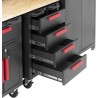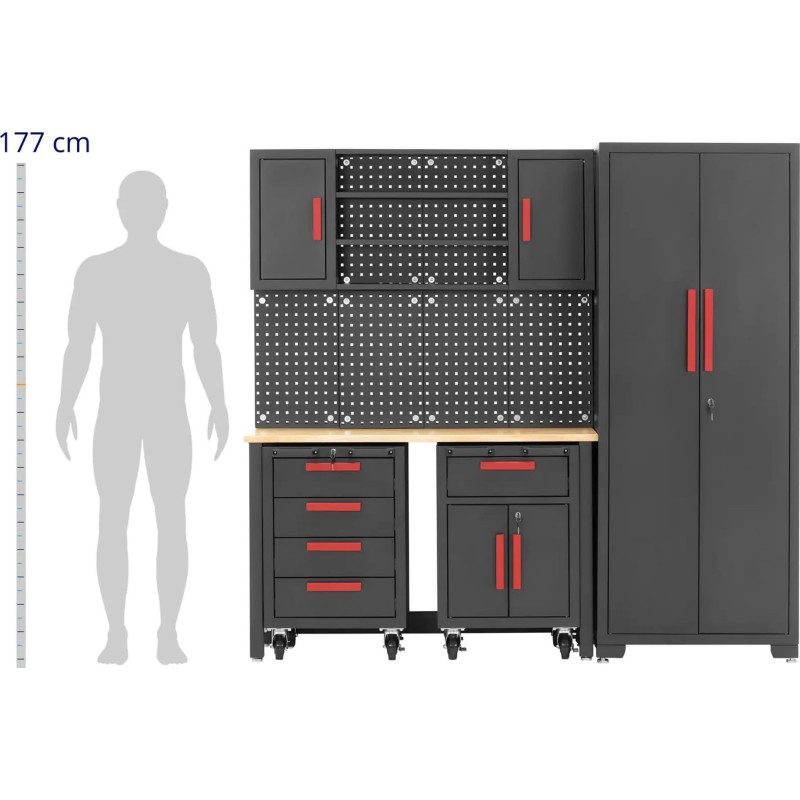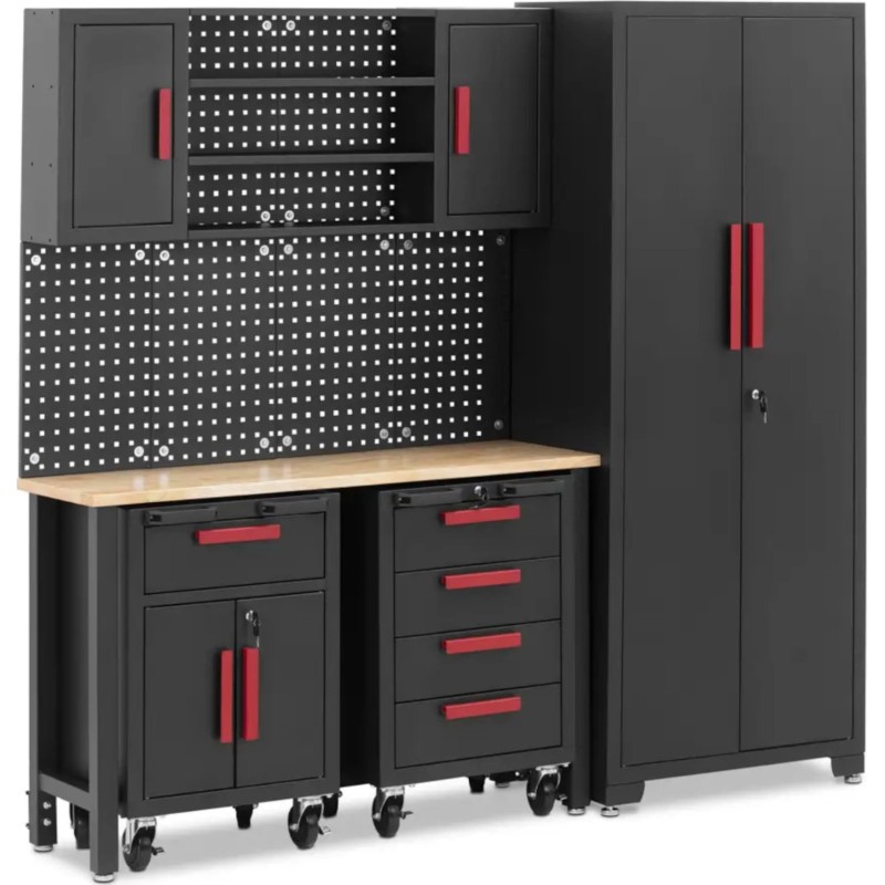 Der abschließbare Werkstattschrank der Marke MSW bietet viel Stauraum. Eine perforierte Wand, 4 geräumige Schubladen und Fächer in verschiedenen Größen bieten Platz für alles, was Sie für die Arbeit benötigen. Der Schrank und die Fächer auf Rollen sind abschließbar, sodass Ihre Werkzeuge immer sicher aufbewahrt sind. Der aus Metall und Holz gefertigte Schrank hält auch intensiver Nutzung stand. Die Arbeitsplatte hält einer Belastung von bis zu 200 kg stand, die Regalböden 50 kg, und in den praktischen Wandschränken können Werkzeuge mit einem Gewicht von bis zu 30 kg aufbewahrt werden. Die Schränke sind aus robustem Stahl gefertigt. Die Holzplatte ist besonders stabil. Die Arbeitsfläche von 132 x 42,7 x 2,5 cm bietet viel Platz für Werkzeuge und Materialien. Der Tisch aus Hartholz lässt sich jederzeit herausziehen und als mobiler Arbeitsplatz nutzen. Der modulare Schrank umfasst zwei Metallschränke. Jeder davon steht auf 4 leichtgängigen Rollen mit insgesamt 2 Feststellern. Wenn man den Schrank nach vorne herauszieht, kann man darauf sitzen und am Arbeitstisch arbeiten. Nach getaner Arbeit schiebt man ihn einfach wieder unter die Tischplatte, um Platz zu sparen. Der Schrank verfügt über 3 Einlegeböden, die in der gewünschten Höhe montiert werden können. Das Werkstattmöbelsystem ist modular aufgebaut, sodass die einzelnen Elemente nach Bedarf angeordnet werden können. Der Schrank steht auf verstellbaren Füßen mit einer Höhe von bis zu 25 mm. Dadurch lässt er sich mühelos an Unebenheiten des Bodens anpassen und auf die richtige Höhe einstellen. Für zusätzliche Stabilität sollte der Werkstattschrank an der Wand befestigt werden, damit er nicht umkippen kann.