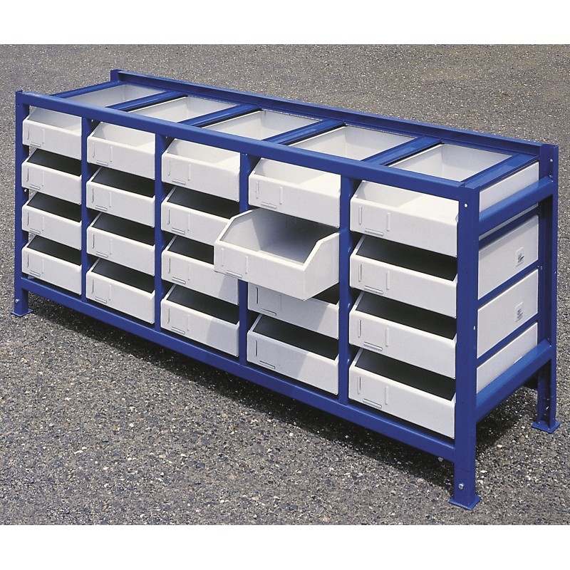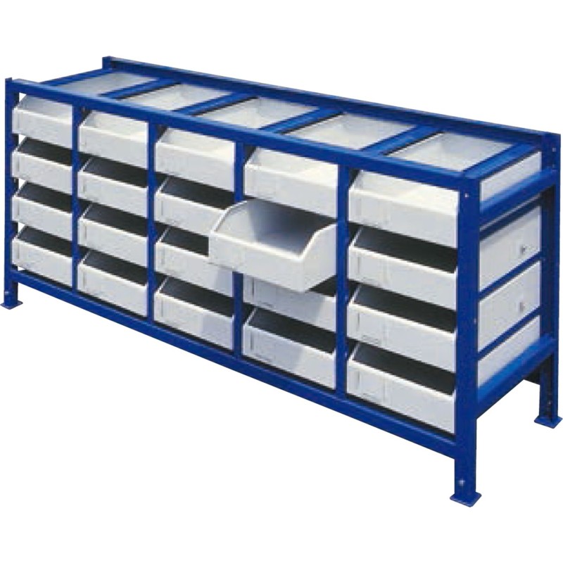professionelles Spezialregal für Werkstätten zur sortierten Lagerung von Teilen und Baugruppen. Die große Anzahl an Behältern im Set bietet umfangreiche Möglichkeiten zur Sortierung von Teilen und Werkzeugen und erleichtert sowie beschleunigt den Zugriff darauf. Stahlrollen ermöglichen ein leichtgängiges Ausziehen der Schubladen , auch bei maximaler Belastung. Vor dem vollständigen Ausziehen sind die Schubladen durch Arretierungen gesichert . Zum leichteren Entnehmen von Gegenständen ist die Vorderseite der Schublade abgesenkt.